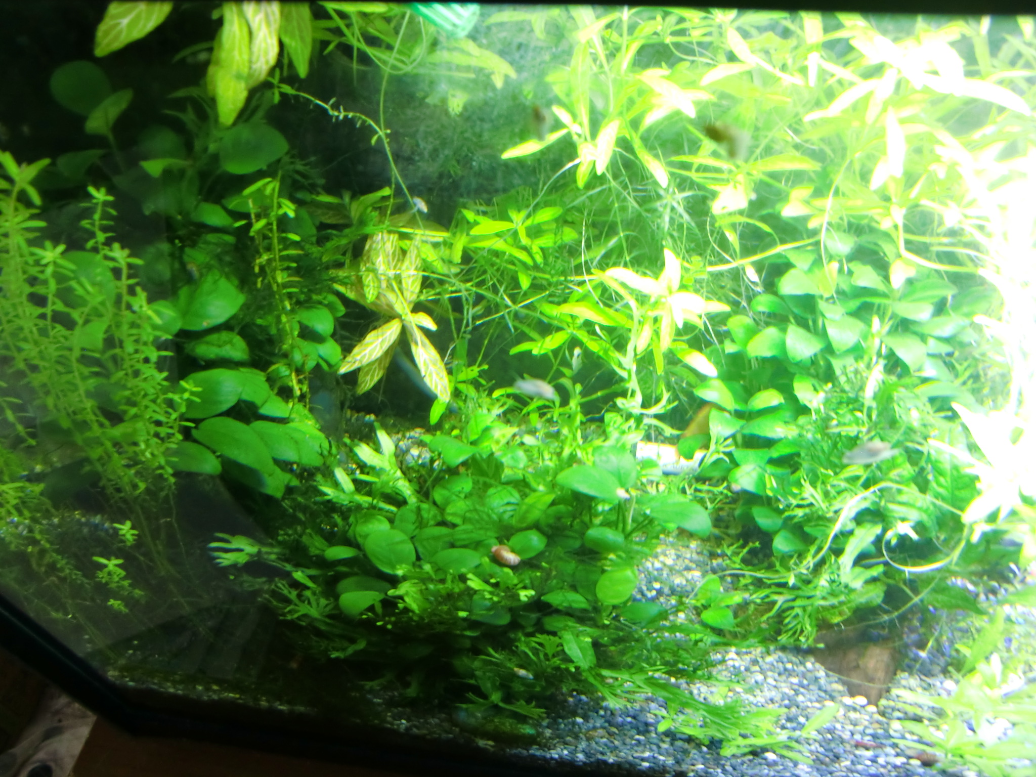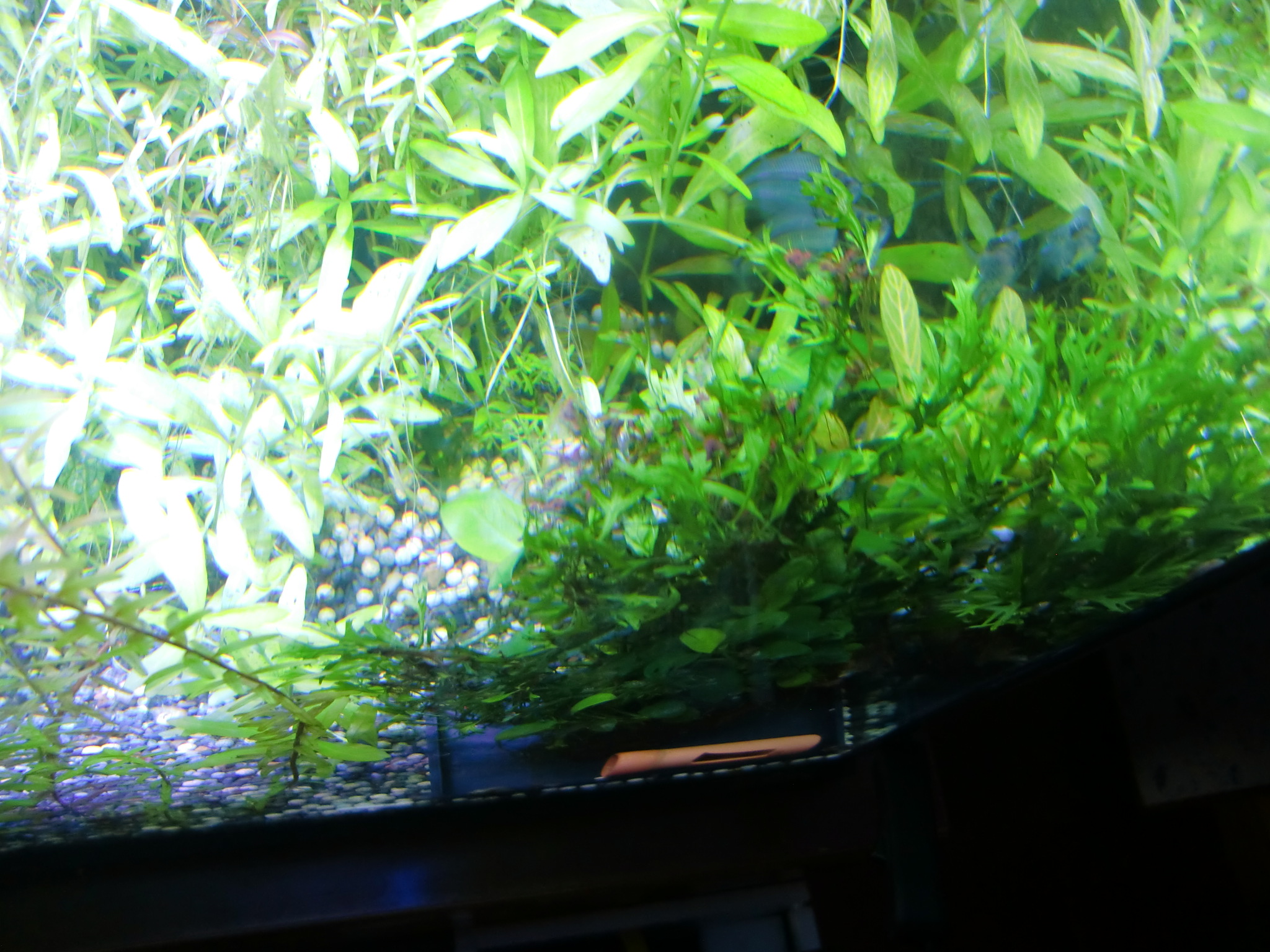 黒ヒゲ藻(黒ゴケ)は酢漬けで赤くしてやろう コケ対策 2013年12月01日 流木に活着させてあるミクロソリウムに黒ヒゲがつきました。2014.3.5追記修正 あああああきたねー。水流と光を当てすぎでした。 もしくは夏場の高水温でミクロソリウムが弱ってコケが付いたのかもしれません。 残暑の終わった10月ごろの写真です。成長の遅い陰性水草の葉のフチにつく黒苔。 自然界では綺麗な水にしか棲息しない藻です。実は黒ヒゲは酸や乾燥にとても弱いみたいです。 器具類についたものは無理に擦らないで、取り出して40分乾かして水槽内に戻すと弱っており、赤くなって1~2週間で生物に食べられて消えます。 今回は流木に活着した植物を乾かすわけに行かないのでコレを使用します。 木酢じゃありません、食用酢でおねがいします。木酢だと薄める必要があるし後日ブリーチしたみたいに枯れることもあります。 今回は食酢を薄めないでバケツにそそぎました。 ミクロソリウムのついた流木ごと水槽から取り出し、逆さにしてバケツに突っ込み、30秒漬けました。 葉のフチには子株が沢山付いてて、根っこがいっぱいあったのですが、かまわず。 くみ出した飼育水でゆすいで水槽内に戻した直後の写真。ちょっと赤くなっています。 実は、肉眼だと赤くなってないように感じたのです。そこでもう一回やってみましたが、やはり変らないように見えていました。 アヌビアス・ナナとミクロソリウム・ウェンデロフにも変化はありません。 まあいいやとほっといて、3日後あたりから赤みが肉眼で確認できました。 その後ヤマトヌマエビが狂ったように黒ヒゲを漁りました。とてもおいしいようです。 酢とエビさんの食欲がすばらしい結果を生みました。子株もダメージなくもっさもさ。 再発しないようにスポットLEDの光をミクロソリウムからずらしました。 以前はこんなに美しく 1年前です。ミクロソリウムは縮れ気味で先端に子株がぴろ~んとついたまま、ロタラは茎だけ、ナナも流木もパイプも髭だらけ。ガラスも緑色(ガラス面は掃除直後です!) この惨劇から水草を捨てずに立ち直ったことをお伝えしておきます。 同じ草とは思えないでしょ?同じ個体ですからマジで。 ナナやミクロは成長遅いから株が同じというより葉っぱも同じやつが写ってます。 それ以前に水槽も同じだけど説明したほうがいいレベルかも? 同じ場所を撮影。 現在 年を越して2014年1月黒ゴケ再発なし。 上の写真は2013年11月ごろで、酢漬けから一ヶ月ぐらいです。子株がもさって親株を覆い隠しています。食酢に根っこごと30秒付けても弱らないのがおわかりですね? 赤くなった黒ヒゲ藻は2週間もあれば消えます。再発の方が早い場合は換水タイミングを短くして、餌を控えて遮光や水流を当てないこととセットでやってみればいいと思います。 再発防止策 注:酢で再発が防止できるわけではありません。 1・換水+レンズ付き照明の強光+ハイグロフィラ多数を成長させることで黒ヒゲの元になる物質(リンじゃないかと思います)が減少している 2018年追記:水槽内の底は、強い光を届けるのが難しく、レンズ付きでない場合、300ワット程必要。高効率タイプのLEDならその半分に減らせるか否かというところ。ロータイプ水槽ならワット数10分の1ほどでもいい。 レンズ付き照明で水槽に向いた演色性を用意するのはなかなか難しく、とくに赤や緑の葉の色がきれいに出ないことが問題。修理対応ができる販売者も希少。 おすすめなのは海水用スポット(全体に青い高色温度、赤球も入ってるとよい)と高演色ビームランプ(電球色なので黄色い)の組み合わせ。設置用アングル台アームスライド(30㎝~60㎝用、90~120㎝用)とE26クリップソケットが必要。2つのランプを同じ場所を照らすように向けます。 弱い光がダメなのは陽性水草が下葉を溶かしてしまうから。溶けた葉から出た養分でまた藻類が出てしまうのです。逆に陰性水草だけの構成なら溶かすことはないけど、成長量が少ないので養分を奪いきれるかが問題。 2・スポットLEDをずらしてミクロソリウムを照らさないようにした 陰性水草はそれほど光を必要としないから弱ることもなかったです。 3・カリウムと2価鉄を添加しているのでミクロソリウムが元気になってきた 元気な葉には藻類がつきにくい。 4・ナチュラルフローパイプ+バブルチョイス(曝気用に)で水流が抑えられた(ディフューザーの強水流曝気とは対照的) 弱くなりすぎて、夜間エアレが必要になりやすい。光がないと水草が酸素呼吸するので、動物が少なくても崩壊しかけました。 5・水換えも藻類の養分を供給するラインであるらしい、水換え直後にこれをやると藻類が消える、ただし活着性の水草に養分不足のような症状がでることも? 陰性水草の難しさ 葉のフチに黒ヒゲが出る 弱った陰性水草に光と水流をあてると黒ヒゲが出やすいですね。 調べたらミクロソリウムは高温に弱いとあります。 ウィローモスやアヌビアスは高温でも平気ですが、
