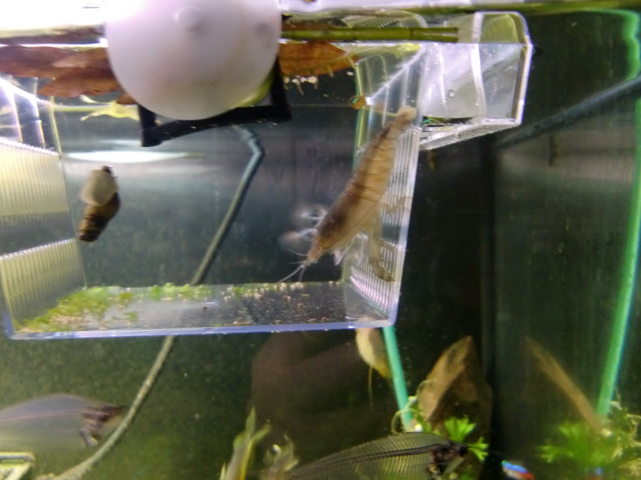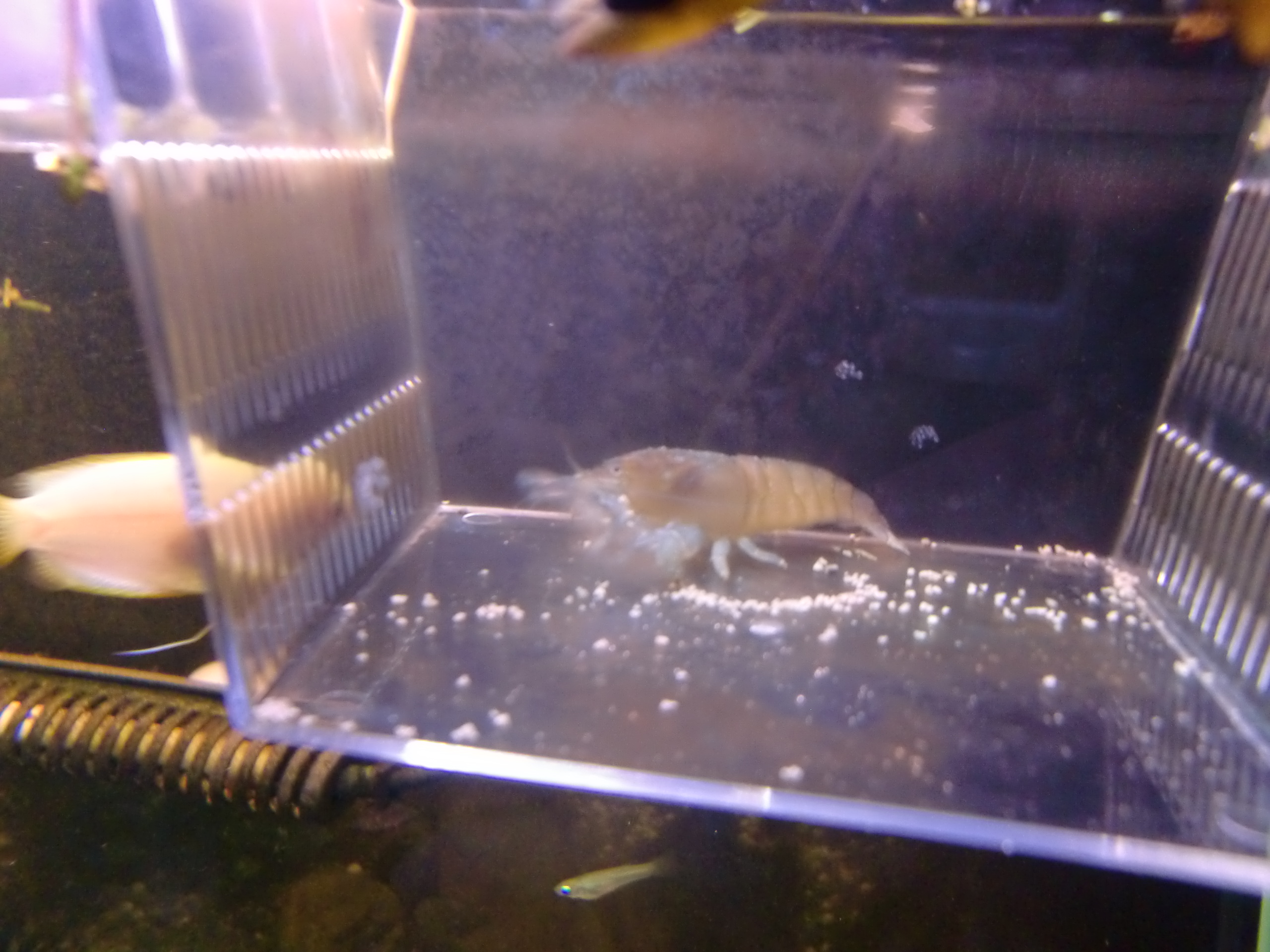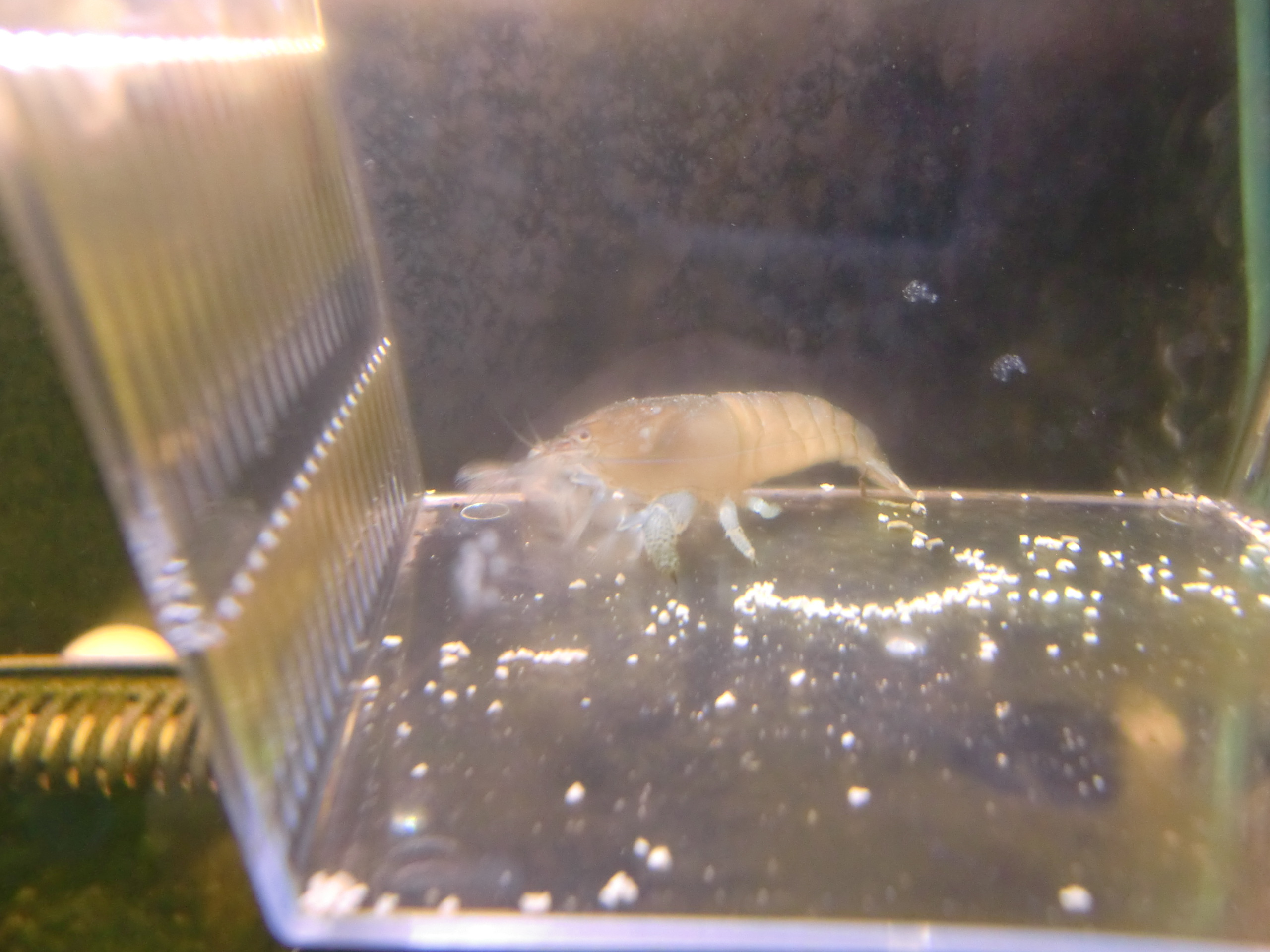 アフリカンロックシュリンプ購入。そして一年 生きもの 2013年08月31日 近所のホムセンで白くなっていた5cm未満のアフリカンロックシュリンプを買って一年ほど飼育した感想です。現在でも生きてますよー。 まずタンクデータ Rio125という拾ってきた81cm水槽(たぶんこれ水量125リットル?) 底面直結外部フィルタ エーハイム2234 水槽クーラー ゼンスイZC200 醗酵式Co2、エーハイムディフューザーのエアチューブに接続して添加 10年以上使用している大磯砂にサンゴ砂とバイオBB弾混ぜたもの(BB弾は後悔) これらは水草入りで混泳放置が前提の構成を考えてのもので、水量に対して生体の数は少ないです。アフリカンロックシュリンプに必要だからではないです。 エサは消灯後にらんちゅうベビーゴールド、プレコタブレット撒くなどしてなんとか維持… いや、食っているかまったくわかりません。 このままだと餓死するかもしれないので、水作フロートボックス を買ってきて餌付け隔離を始めました(フロートボックスはたぶん奥行き8cmぐらいなので大人サイズのアフリカンだと入らないと思います)。 撒いてある白いのがメダカの餌で、スポイトで入れています。入れてもすぐには反応しません。 ずっと水流に手をかざしているだけです。一時間後に見たら食べ始めてました。 驚いたのは、これでも1のみにできず、口に入れてもポロポロ出てくるだけだったことです。 ただし溶けてきたものを食べることはできるようでしたのでこのまま様子をみました。 スピルリナの錠剤、あおさ粉(下の写真)を買って入れてみましたが食べません。スピルリナはすり潰して粉にしてみましたが、特に反応ありませんでした。 どうやら細かい栄養物なら反応するわけでもないようです。水流に手をかざしたり、手を振っている動作は、寝ているときにやっているだけなのではないでしょうか。 このアフリカンはヤマトヌマエビのメスより2周り大きい程度のサイズで、だいたい4~5cm弱でしょうか。1日に食べる量はめだかの餌でも数粒食べるかどうか、らんちゅうベビーゴールドで2粒食べるか2、3日全く食わないぐらいです。 大きいアフリカンは体力の維持が難しいといわれるほどよく食べるらしいですね。 この隔離は、餌付け以上に人に慣れさせるのが目的でしたが、半年続けたけれどもあまり効果はなかったです。まず目が小さくて人を認識しているかもわかりません。常に隠れていて、餌を食べに出てきたときも、大きな物影が動いたら逃げ出す、程度の反応しかしません。 フロートボックスのフタは輪ゴムでとめていましたが、とめ忘れたときに、本水槽に逃げ出して流木の裏に隠れてしまうということが2回あり、慣れさせるのはあきらめてそのまま本水槽内でキープすることにしました。 するといつも同じ流木の裏に住むようになったのでその下に、皿になるものを敷いて餌を与えることにしました。 この餌をローテーションで与えてますが、スピルリナ入りの餌もあるためか、体が少し青くなってきています。 フロートボックスを使って餌付けや体力の立て直しはできたけど、隠れ癖はなおりませんでした。 玄関に設置しているのでドタドタと人の出入りがあることと、袋ごと落とされたからでしょうか。 しかし購入時に弱って白かった個体でも、この水槽で1年半経過して、今は弱ったそぶりをみせません。底餌を食べるようになれば丈夫で飼い易いエビだといえると思います。あいかわらず出てこないし全く大きくなった感じはしませんなあ。 [3回]