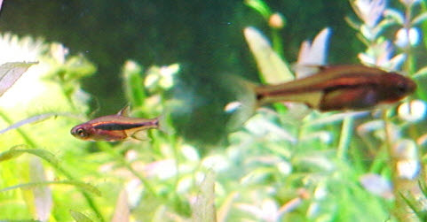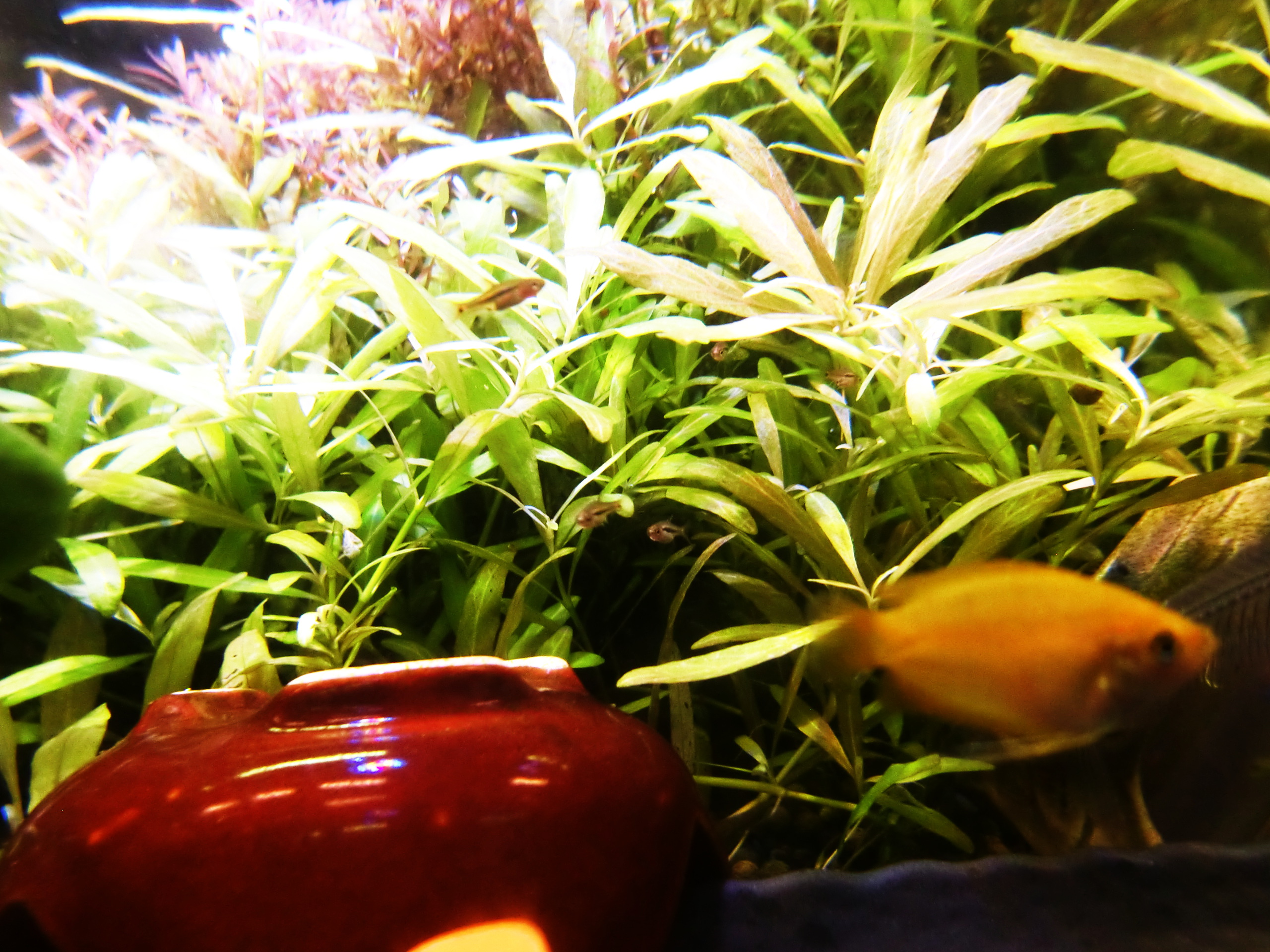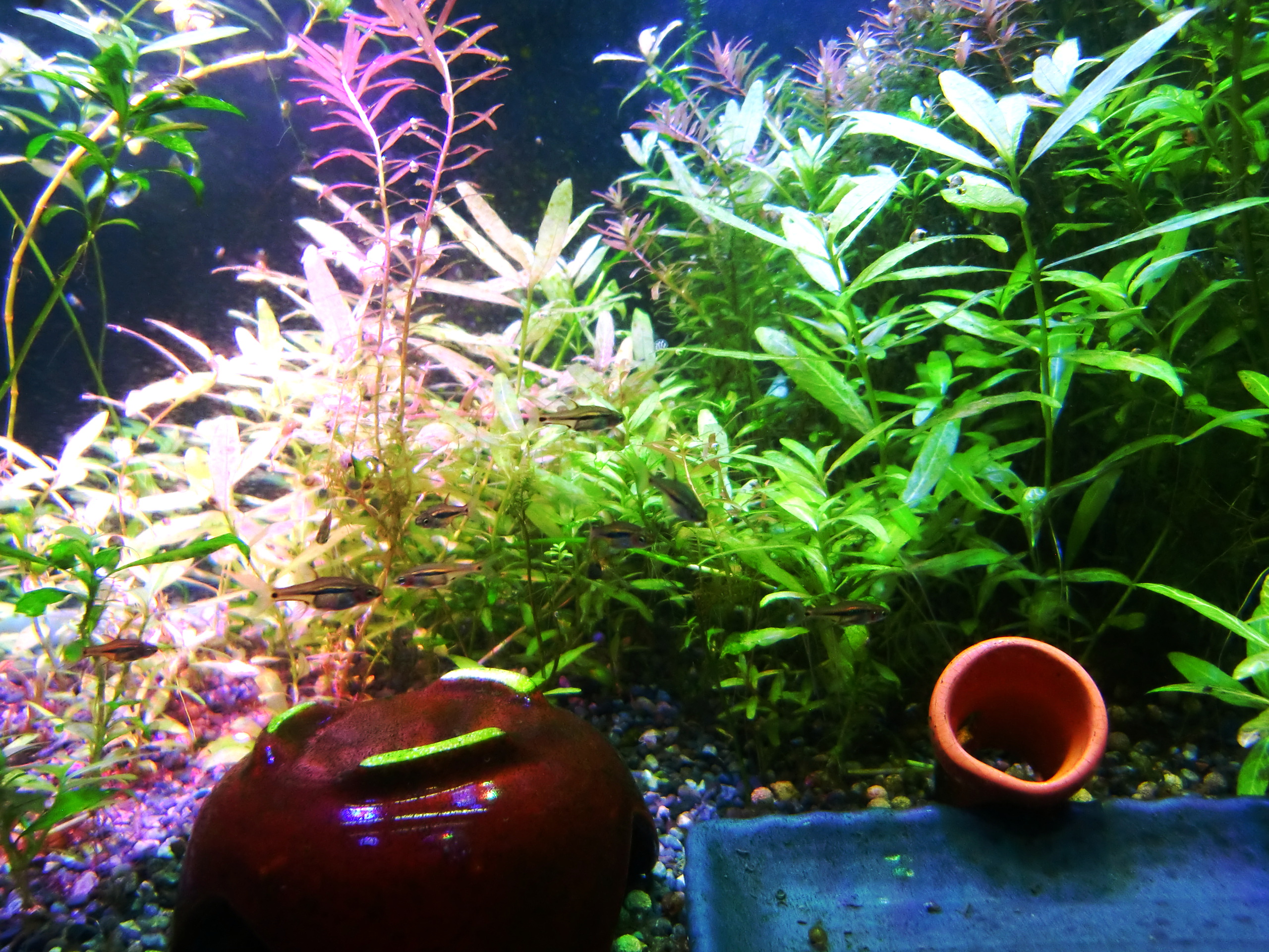 ボララス・ウロフタルモイデス【泳ぐびっくりマーク】 生きもの 2014年04月20日 2cmほどの超小型美魚です。 動画取りました。 銀の魚体に黒いサイドライン、尾ひれの付け根に黒いドットでびっくりマークのよう。 びっくりマークを囲むように金色から赤色を帯びたアウトラインのようなものが見えます。 小さいのにこの前のカラムナリスにかかりませんでした。購入時の状態がいいと小さくても丈夫なんでしょうか。 水温25度、pH6以下の水槽にお迎えして3週間程度経ちましたが、いまのところ問題なくすごしているようです。 ボララス・ウロフタルモイデスは結構群れやすいみたいだから沢山増えたら大きな水槽でも綺麗になりそう。 いまは1cmぐらい。大人でも2cmなので、中型魚には一口で食べられてしまうかもしれません。 うちのグラスキャットは食べていませんが、大きい水槽に水草たっぷりという食べられにくい環境。どんな水槽にもオススメできる組み合わせではないです。 模様がシンプルかつシャープで好きです。黒いラインと黒いドットの周りに金色っぽい縁取りが出てます。 口が小さいので稚魚用フードがいいです。テトラミン ベビーを水にといてます。 そのまま落とすと沈まなくて、深い水槽なので浮いた餌を食べに来ません。 初日から人口飼料を食べましたが、すぐさま餌くれ踊りをしてくる感じではないです。 購入からの良好な状態をうちの水槽でキープできるかが課題です。 薬浴が終わり、カラムナリスの被害ゼロで済みました。 ライトを照らしてない手前の方にいるところ。 奥の水草の間に入ってくれれば明るく撮影できるんだけどな。エサをねだっています。 [0回]