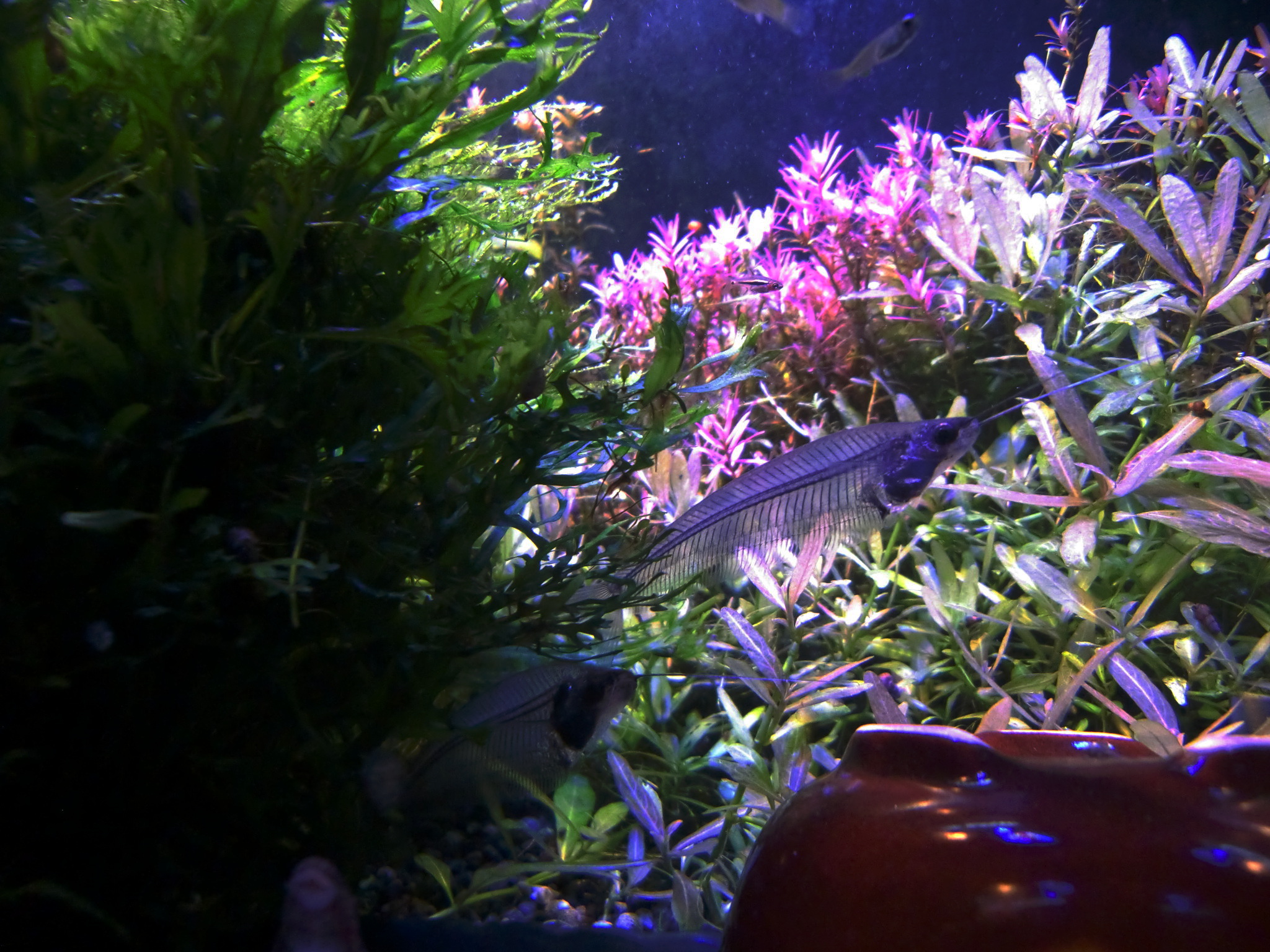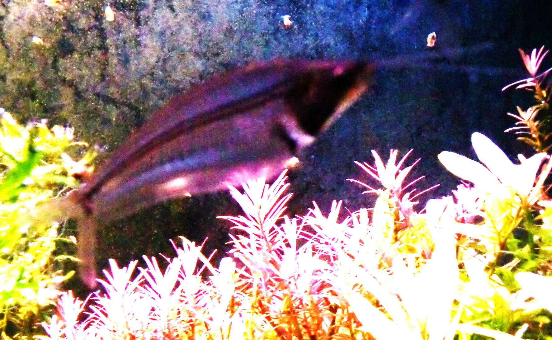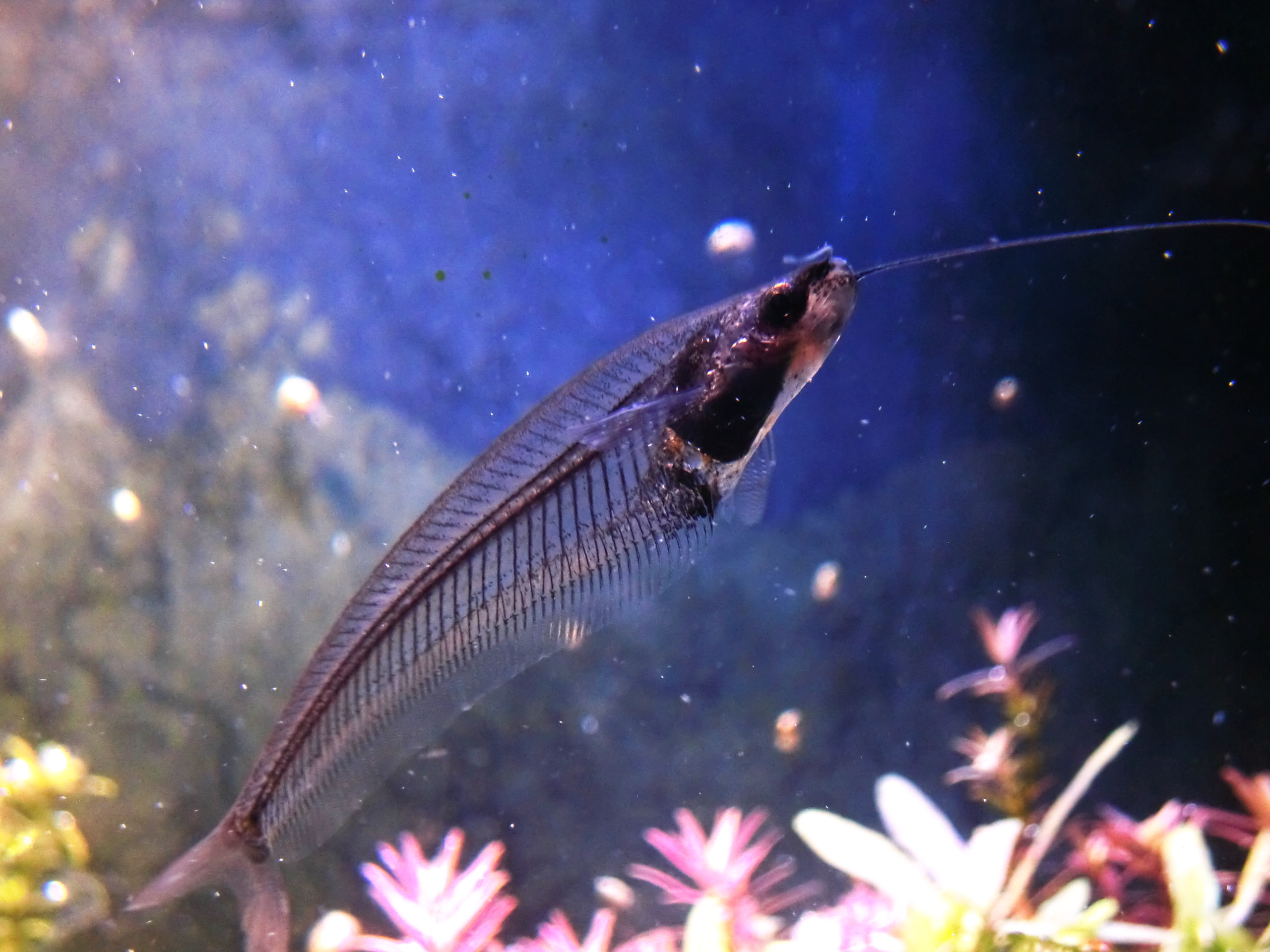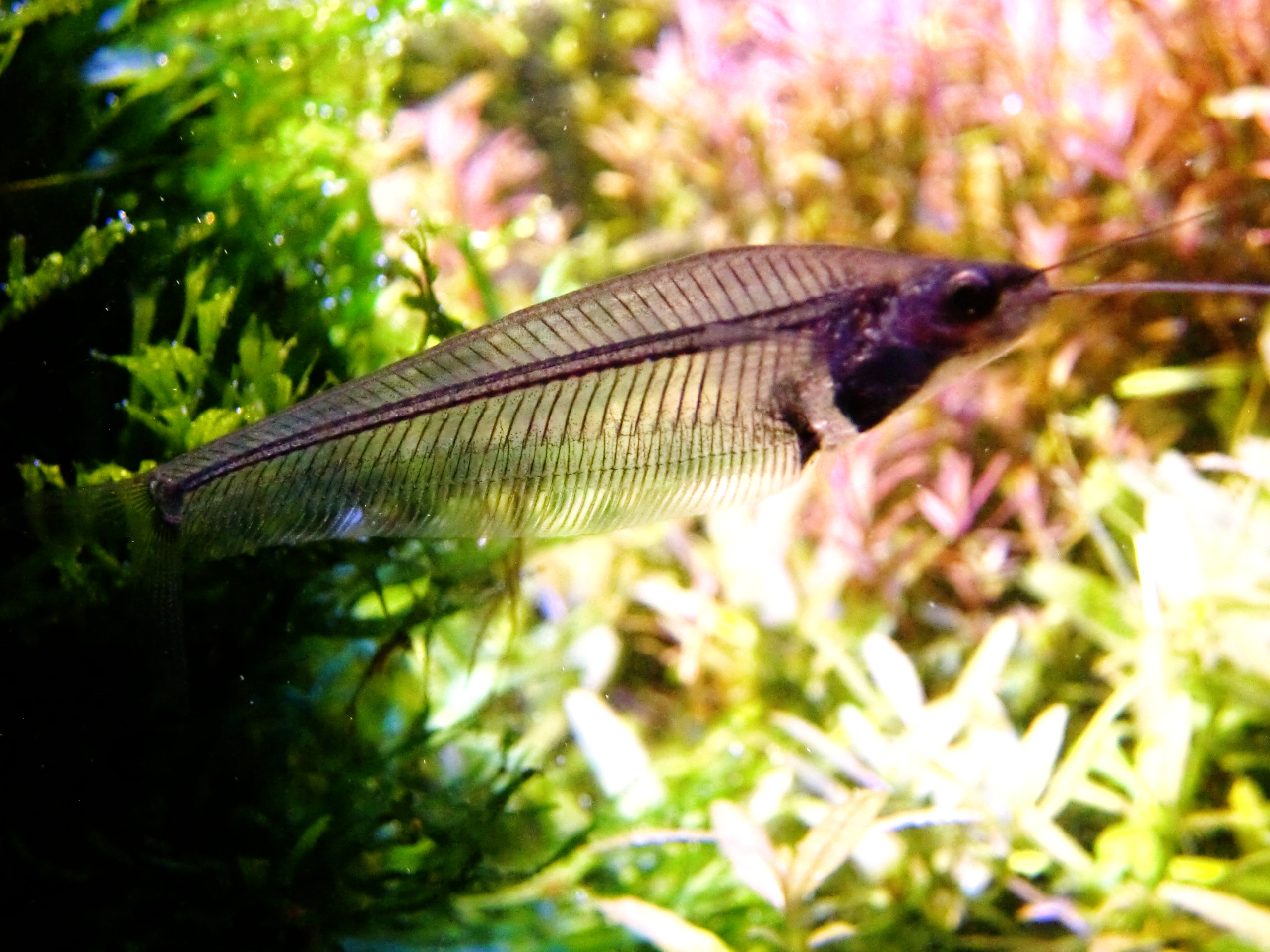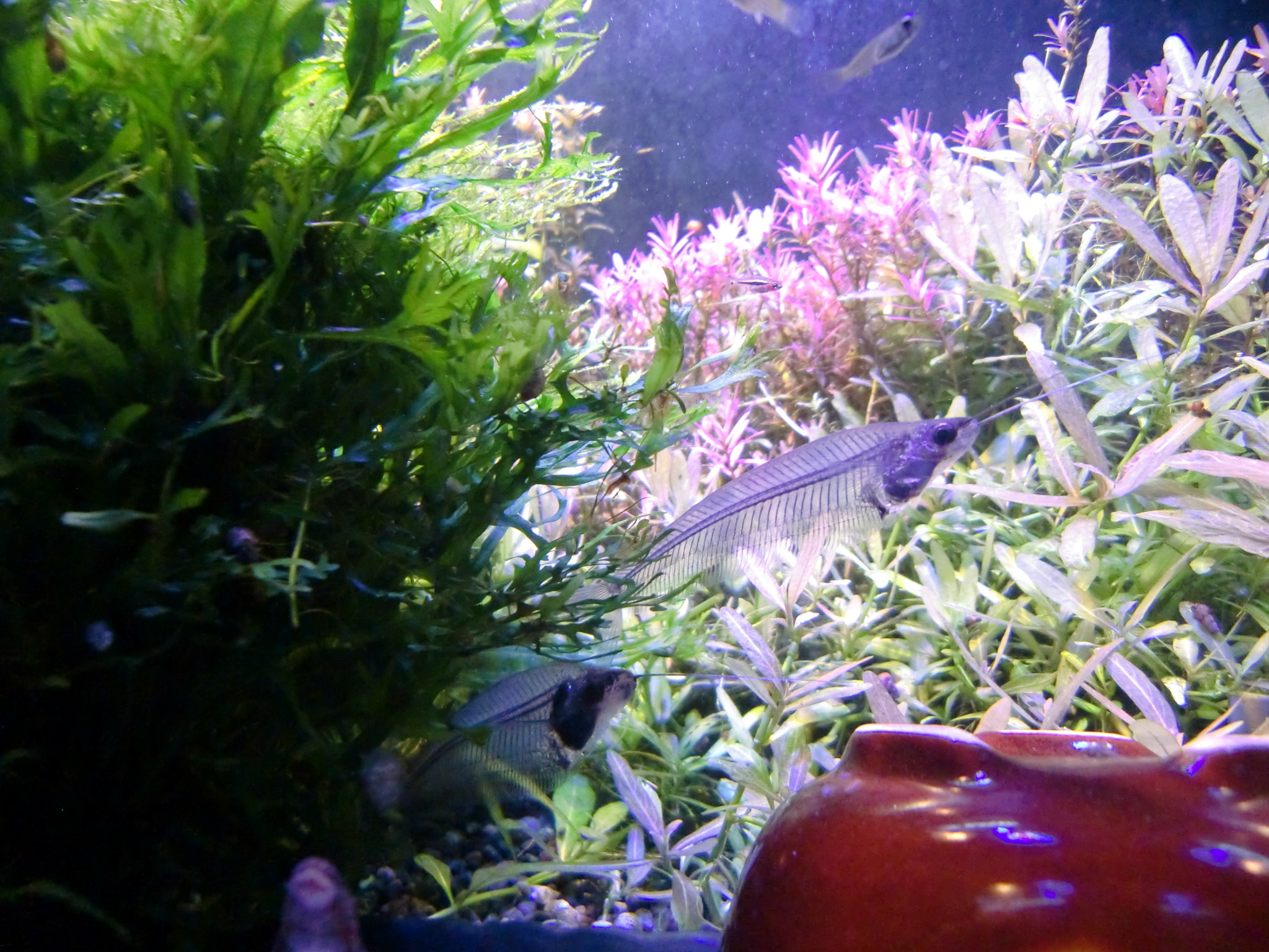 グラスキャット【中身は銀色】 生きもの 2014年03月29日 最近はグラスキャットとだけ呼ばれているのでしょうか。以前は頭にトランスルーセント~ってついたんですが。 うちの玄関にある水槽で一番大きい魚ですが、全然話題に上がらない気がします。 やっぱり透明すぎて見えないのか!? おとなしい、髭が長い、丈夫、透明、ご長寿。 長所だらけなんだけどなー。 見えないんじゃ仕方ないや。 まるで深海魚のようなのでベアタンクに薄暗い照明の方が似合う?? 怖がりで隠れがちですが、スポットライトをエサ場に当てないで奥を照らすことで、手前に出てくるように仕向けています。 それでもちょっとメンテナンス中に脅かしてしまってからは一匹出てこなくなって困ってます。 食わない? よくエサを食わないと聞きますが、生餌でなくても餌付くようです。 ただし、エサ取りが下手。小さなボララスも襲いません。水草もっさりで逃げ道が多いので。 頭のサイズに比較して目が大きいので、視力は悪くないかもしれないけど、まぶしいのが苦手なもよう。 もしベアタンクだったら夜中にボララスを食べたりしないとは限りませんね。 暗くした方がエサ取りが上手です。体をくねらせて後ろのエサもパクリ!前のエサにも疾走して食いつきます。 ライトを消してエサに慣れさせると、だんだん明るくても食べられるようになります。髭で確認しながら食いつきます。 エサ 現在あげているえさは、適しているかわからないけどらんちゅうベビーゴールド。半日~2日に一度1粒~2粒程度食べています。 (カラムナリスで弱らせちゃってからは食べてくれないです。グロウCに戻しました。) まだグラスキャットが小さかったときは、これは食べられなかったので、少し小粒のどじょう養殖研究所グロウCを食べてました。 小麦粉を使わないことで消化がいいというエサです。小粒といっても小型カラシンにはちょっと大きすぎるサイズ。 中型魚(10cm近くなる?)ではありますが、「エサ食いまくり、おねだりしまくり」ではないので、3匹飼っていて上部濾過が必要になるほどの汚し方はしないです。 高貴なお方 落ちたエサは拾って食べてくれませんので、低層魚すなわちボトムズ野郎どもがほしいところです。 底をあさらないのは水草で手狭になってるからかもしれませんが、浮き袋の位置が前のほうなので逆立ち泳ぎができないような感じです。 水面は上手にあされるようなので、浮くエサに慣れさせるのもいいかも。 食べられない大きさのエビといえばヤマトヌマエビ。残飯処理能力は一匹では足りないかも。 混泳 レッドビーシュリンプなどは、うちでは半年以上食べられてなかったけど(硝酸塩濃度増加で全滅!)もしも慣れてしまったら食いそうなサイズ。 でもグラスキャットは狭いところに入り込んで底のものをパクパクやるタイプではないので、隠れ家などのサイズや配置で同居可能。 うちでは、アフリカン・ランプアイやボララス・ウロフタルモイデスがいますが食べてません。 一口で食えないサイズだと食いつかないようです(無保証ガクブル)。口は歯がないみたいだけど。 浮き袋の都合なのか、体を水平に保つことしか出来ないようで、口を下に向けて底砂を漁るという芸当をしないために、底の方にうろうろしているエビたちを上手につつけないのです。 だから石や流木を置いたりして底に凸凹を作って、体を立てないと底をつつけないような状況を作ってやるとエビに安全な水槽になると思います。 繁殖 うちの3匹の姿を見ると背ビレが大きいのと、背ビレが点みたいに小さいのがいますので、オスメス両方いると思うけど、発情したところをみたことがないので、何かのきっかけが必要なのかもしれません。 白点対策の要は温度管理かも? グラスキャットは水質の悪化にはかなり強いけど、白点病になりやすいという話を聞きます。 淡水魚なのに白点病によくかかるということは水温の変化に弱いのかなと。 うちでは季節に合わせて温度を管理しているからか、白点病にかかったことがありませんので、うちの温度管理と同じにすれば防止できるのかもしれません。 ヒーターは年中使います。温度固定ヒーターではなく水温を設定できるサーモスタットとつなげることをおすすめします。 年間通して25度固定にすると年中クーラーが稼動して電気代がかかりますし、そこまでするほど暑さに弱くないので週単位で夏へ向けて28~29度に上げていき、冬へ向けて24度~25度へ下げていきます。 春から夏 春は水温が上がりだす季節なので、そこからは水槽の水温の上限±1~2℃程度にあわせた水温設定にします。 つまり気温が高い日の水槽の最高温度より下がり過ぎない程度の温度にしておくのです。 初夏はとくに急に暑くなったり寒い日が来たりして温度急変しやすいので28度まで徐々にあげておいてからクーラー ZC-200で水温コントロールしてます。外部フィルターエーハイム エココンフォート 2234に後付け。 くわしくは【換気
