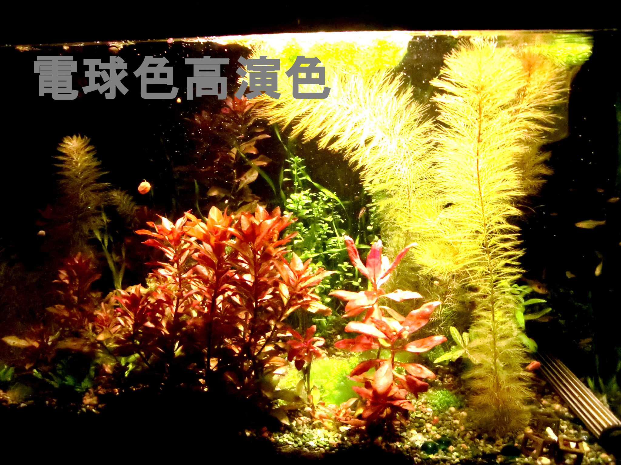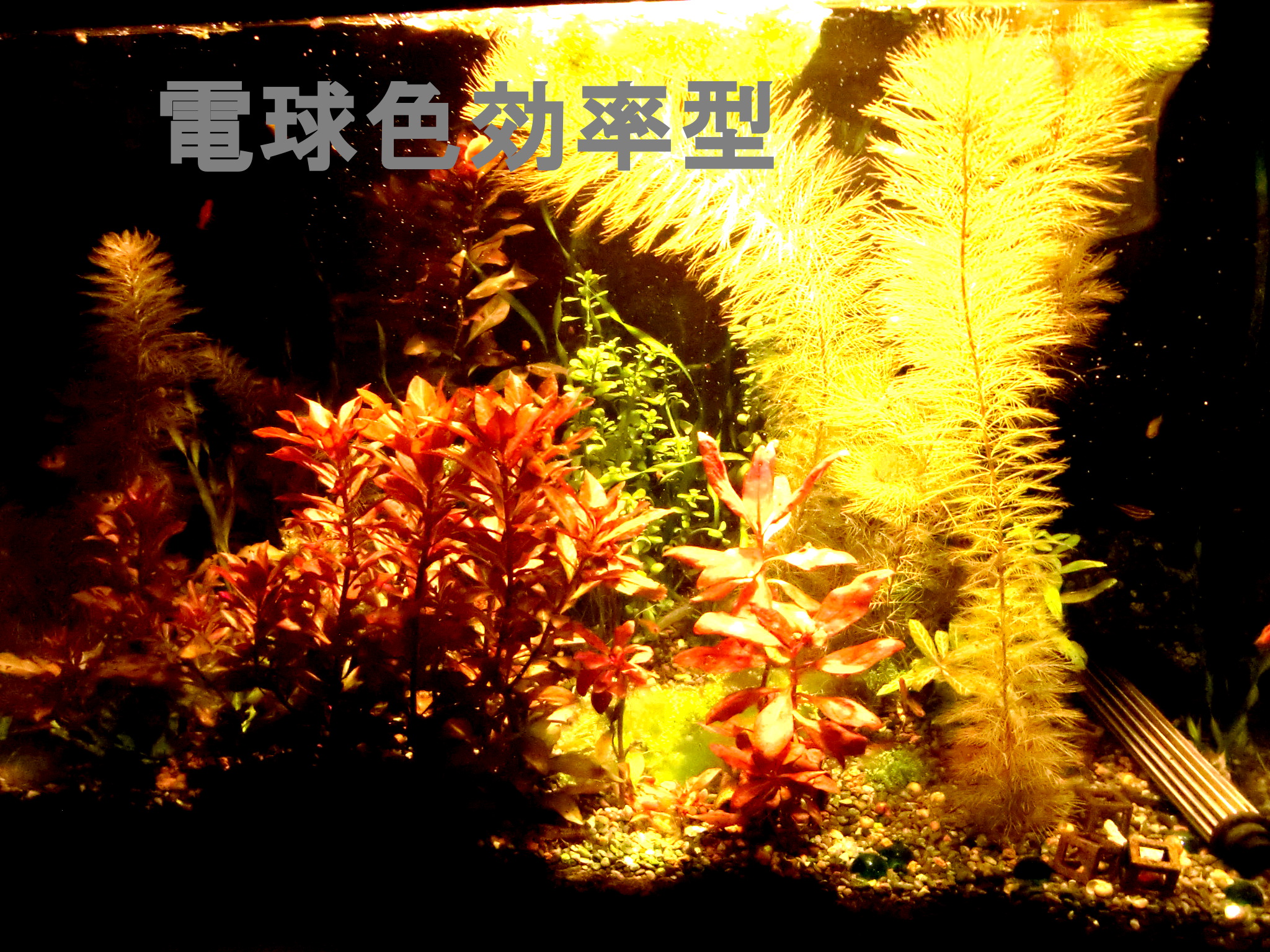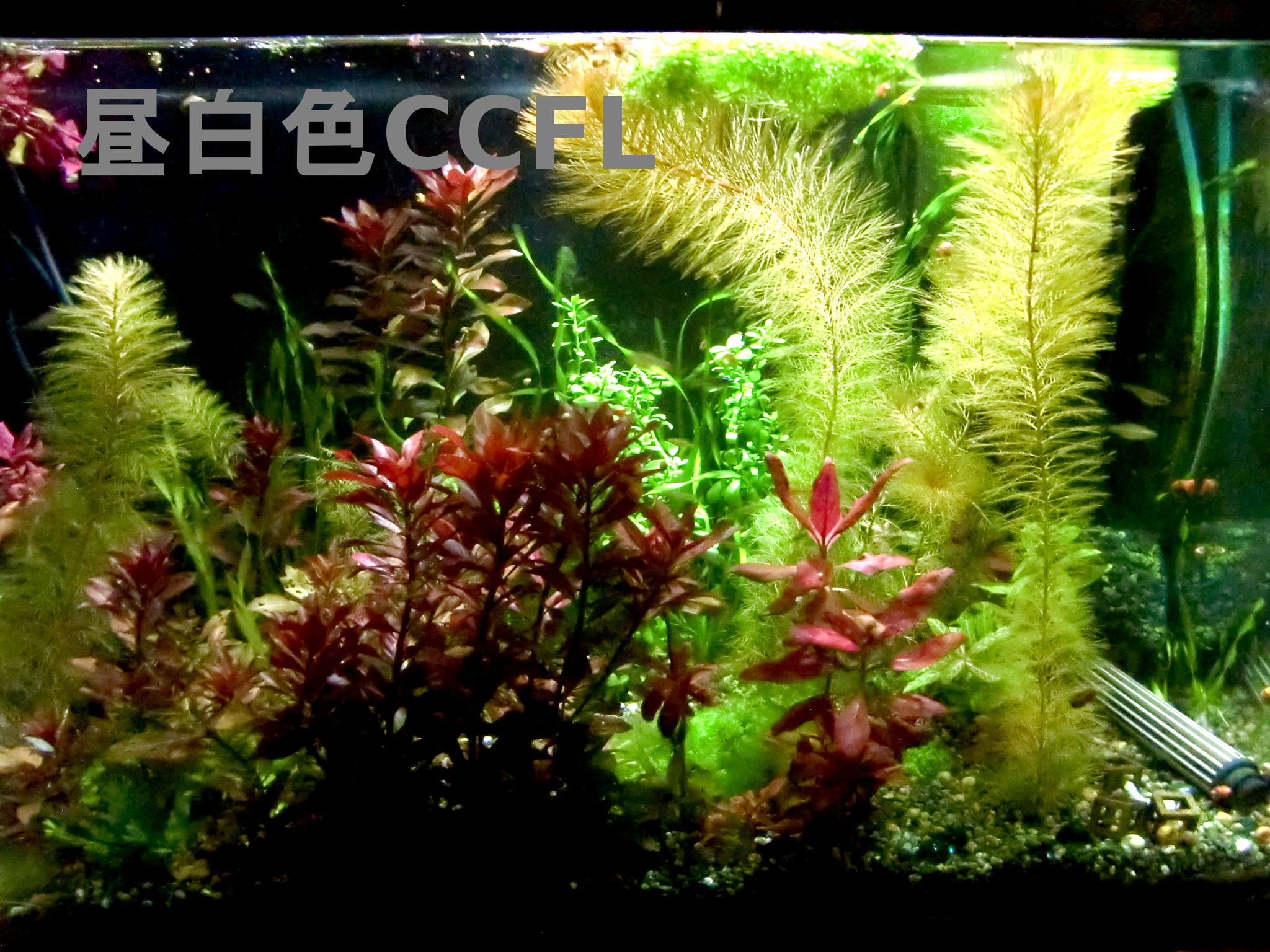 白色LEDの比較撮影 LEDライト 2019年03月08日 現在使用中の白色LEDの映り方を比較するための写真を撮影しました。 前置き 各白色LED機種(ほぼビームランプ)を一つつづ同じ場所に取り付けなおして撮影しました。 財布的な都合により一機種につき一個だけしか点灯できないので、写真映えしないです。とくに周りが暗いのは、カメラの都合上、光が集まって強い証拠だということに留意してください。周辺が真っ暗なわけではありません。 ※明るさはカメラの測光機能により平均化しているので、色味だけの比較用です。 同じ設定で撮影すると暗い電球の写真が真っ黒になるからです。 カメラのホワイトバランスは「昼白色蛍光灯」という設定。 古いデジカメなので場面に適した調整がうまくできないので、GIMPというソフトで明るさとコントラストだけを調整。 LDR12L-W/150W 東芝ビームランプ電球色150ワット形相当 LDR19L-D-W(後継機種LDR12L-D-W/100W 演色性重視 100W形相当 電球色) 明るさは落ちるものの、緑色の葉の色合いにご注目。 60W型CCFL(蛍光灯電球と同じスペクトル) 比較用です。明るさはかなり落ちているけど増幅してます。 LDR12N-W/150W 150W形相当 LDRは東芝製ビームランプです。 一番上の2つは電球色という色温度のビームランプで、効率型と高演色型では同じ色温度でも見え方がかなりちがうことが映っていますね。 効率型は昼白色と電球色の2つあり150W型白熱電球と同等の全光束です。 高演色型は電球色しかなく、100W白熱電球と同等の全光束です。 CCFL電球は3波長蛍光灯と同じ色の出方をするので基準としてご利用ください。 この写真で明るさは比較できません。 カメラが自動的に調整するからです。150ワット形相当という機種が100ワット形相当と同じような明るさに映っていますが、肉眼では150ワット形相当の方がずっと明るいのがわかります。 またCCFL電球は水槽の上方向にも光が飛んでいく都合と60ワット形相当であることから、かなり暗いです。 電球色効率型のLDR12L-W/150はファンタジアタイプが故障したのでメーカーに問い合わせたら交換対応という形になって、ファンタジアタイプが廃版のため、こちらを受け取ることになったものです。 普段はこれらすべてを照らしてさらに2つの海水用スポットライトをてらしています。 海水用スポットライトの色は青や赤がかなり強いものがあります。 緑が強いものがないのが残念。 海水用スポットライトの機種はグランクリエイトで、保証期間以降も修理対応ができるところがポイント。 その分ただの輸入代理店より高価かもしれませんが、「1年以上経過して壊れたら問い合わせても無視」というのを2つの販売者から食らっているのでメーカー選びは大切だと思います。 海水用スポットライトも点灯しています。 フラッシュを焚いて撮影した写真。 真っ赤な葉の水草の育て方は、なんといってもできる限りビームを当てることに尽きます。CO2はあった方がいいらしいです。 底砂は大磯でも可、というかソイルはいたずら程度に園芸用を少量撒いたことしか。藻類のもとになってしまったのでいらなかったかも。 赤い葉と緑の葉の美を綺麗に鑑賞するにはビームランプの機種選定にこだわることになると思います。 ランプ取付基部はカミハタアーチスライドBS900とDS900を使ってますが、60㎝未満の水槽にはカミハタ製にはないのでコトブキ製のスタンドも選択肢でしょうか。 ●コトブキ ライトアームスライド90~120cm水槽用スタンド ●コトブキ ライトアームスライド30~60cm水槽用 ●カミハタ アーチスライド BSベーシックセット 600横600~720ミリの水槽用スタンド DSダブルシステムキット600でバーを2本にできる ●カミハタ アーチスライド BSベーシックセット 900横720~970ミリ DS900で2本に拡張できるし丈夫で安価。 基部が樹脂製でガラスを痛めにくい。 DSで2本にしてます。高さも段階調節でき、ボルトを穴にはめるタイプだからずり落ちないです。写真は最低限の高さ。361~561mm3機種共通。 横は無段階調節。 水槽上部のごちゃつきを消しゴムで消してみたけどBSのよさは伝わるかな? ●カミハタ アーチスライド BSベーシックセット 1200横970~1220ミリ DS1200 アーチスライドにクリップソケットを使用してます。 【マルカン】クリップソケット ライトの光が直接目に入らないようにフードを粗製乱造しました。 百均のレンジフードに百均ハトメパンチで穴をあけて、紐を通し、アーチスライドに結びつけるだけで、光をさえぎってくれます。 布なども重ねてパンチを空ければ見た目も整うかも? おまけ 廃版になってしまった名機なアクア用白色LED 周りまで明るいですが、長方形に照らすのでガラス面を照らさずにすむところが名機でした。 [0回]