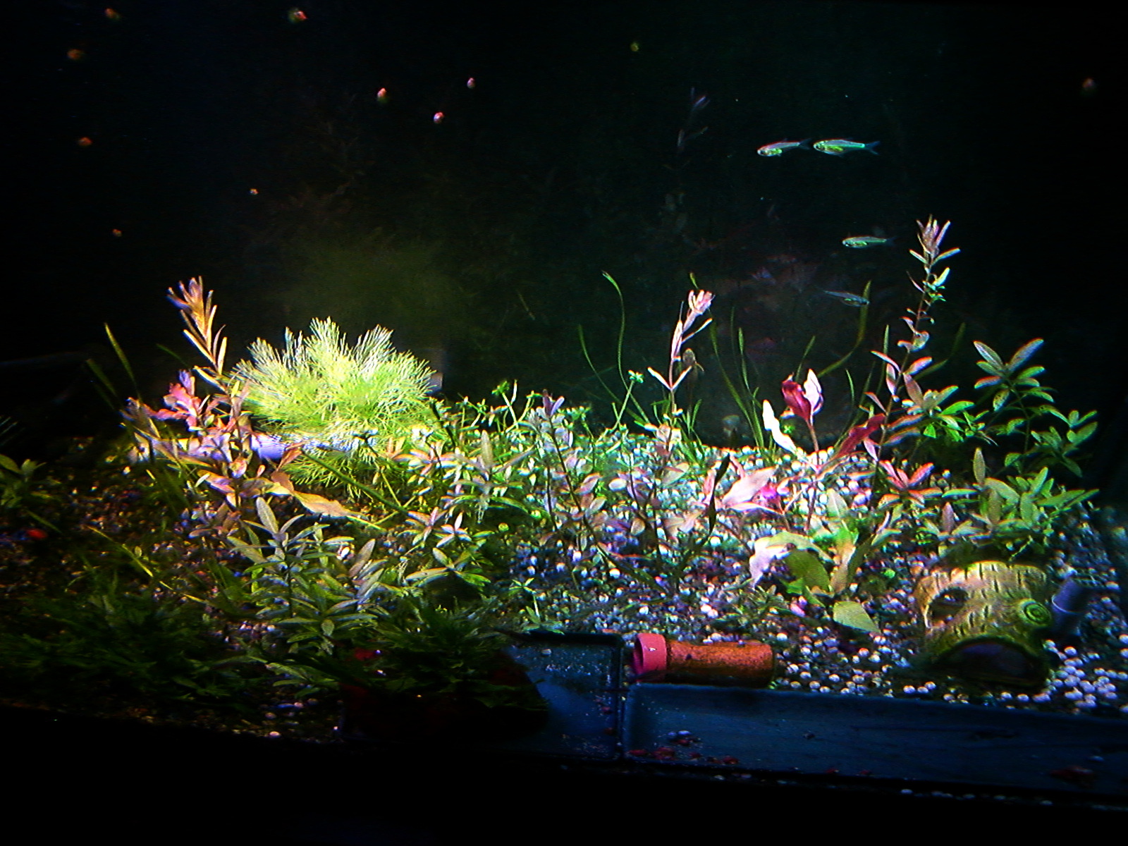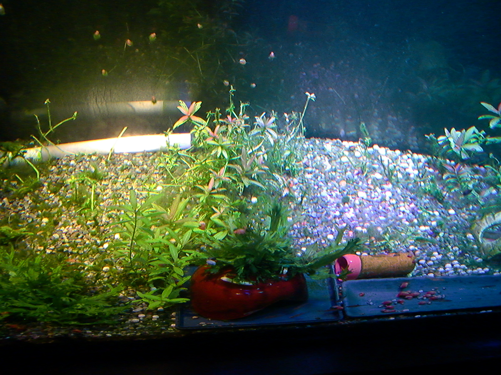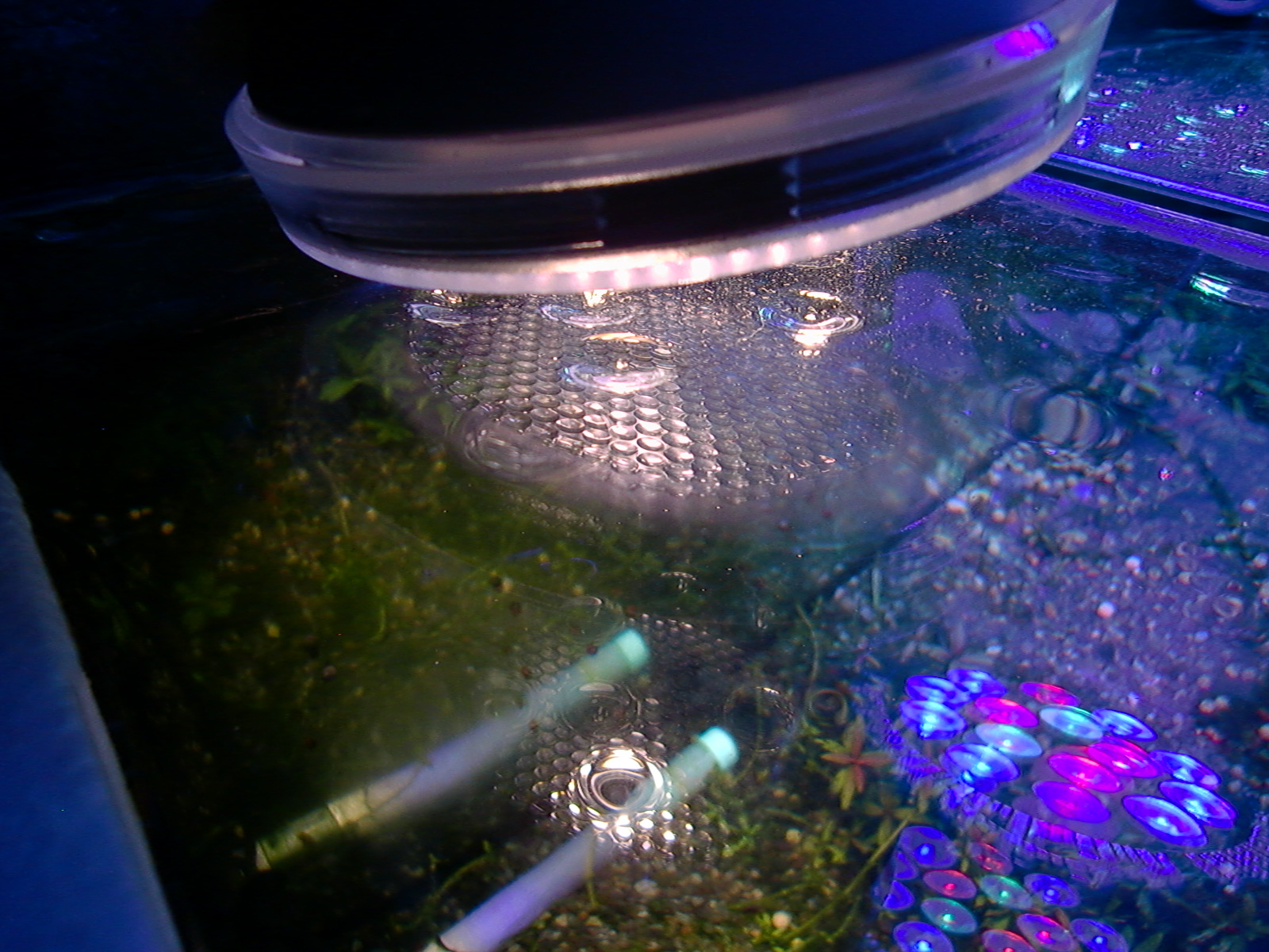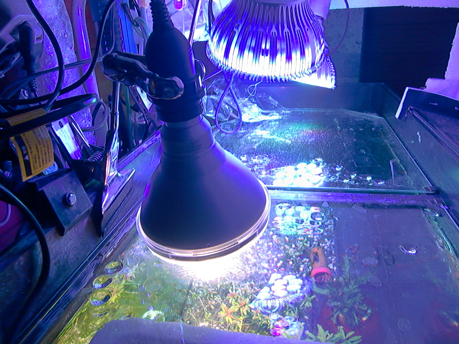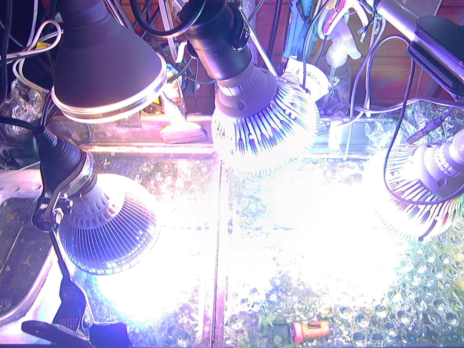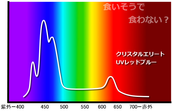 【鮮やかファンタジア】熱帯魚水槽に東芝ビームランプ LEDライト 2014年12月27日 ライトを一個だけ東芝ビームランプLDR15L-W/Fに取り替えてみました。 追記:2018年9月現在はメーカー取り寄せ品になっていて入手困難かも? 現在の高演色ビームランプ100ワット相当LDR12L-D-W 温かみと鮮やかさが両立した名機。水草を追加して発色を比較。 かなり光が黄色い電球色で、ファンタジアタイプという、物が鮮やかに見える光のタイプです。 通常の白色LEDのスペクトルは黄色の波長がピークになって両隣の緑と赤で落ち込んでいくスペクトルなので、ほかの色が薄くなりやすいです。 白色LEDで水草はそれなり普通に育つ(太陽光より落ちるが蛍光灯と比べたら良い、検索できた実験ソースもうちの水槽も同じ)けど人間の目は繊細に感知しています。白色LEDより3波長蛍光灯の方がおおむね鮮やか。 ライトは、光の3原色の青赤緑の波長だけのスペクトルで発光すると、物が鮮やかに見える白色光になります。これが3波長。 この色を薄める波長が、黄色とシアンらしく、これを減らせば鮮やかにできるが、白色LEDはもともとシアンが薄いのが幸いして、黄色だけカットすれば鮮やかに照らせるという理屈です。 ファンタジアの公表スペクトルの模写。かなり黄色成分がカットされています。 予想より明るいです。黄色をカットした分、通常モデルよりやや暗いのかもしれませんが。(商品表示に100ワット相当となっていて普通の2波長ビームランプは150ワット相当になっている) レンズがあるので横から見てもまぶしくないですが、人に向けないように気を付けるべきでしょう。 ボディーはLED特有のヒダヒダがなくてシンプル。 まだコケだらけの水槽でわかりにくいけど、葉の色は鮮やかでしょう? 肉眼の印象でも、温かみもあるし緑色も鮮やかに見えます。 光色が黄色いのは主に緑と赤の混色光(青と黄色も少ないけど入っている)。 トリミング直後でほとんど草が生えていませんが、配光具合を上から確認。 暗めに撮影しました。 明るく撮影するとこうなります() ※肉眼ではこんなになりません。 左半分が東芝ビームランプ1個で右半分がノーブランド15W(黄色波長の強い白色LEDではない原色4色混合なのでもっと鮮やかだけど不自然さがある、追記:2017年壊れました、連絡先も不通…)のスポット2個での明るさ。 東芝ビームランプの照らす範囲は30度と狭いけど、その範囲外もソフトに照らしてます。 手前のミクロソリウム・ウィンデロフにコケを生やさないように奥へ向けて照らしています。ビームの何割かバックスクリーンに当たっています。 ビームの中心をもっと前にして明るさを生かすには、ミクロソリウムをもっと前に植えなおす必要がありそう。でないとモズクみたいなコケがついてしまうので。 右端の青みがかっている場所は別のライトが当たっているエリア。 LDR15L-W/Fはビーム角30と狭いけど、周りにソフトな光が広がっている形です。 中心の強い光を、手前の陰性水草に当てないようにしています。 暗く写っている場所は肉眼だと真っ暗闇ではないです。 魚影や葉陰が底砂に映ったりして水槽内が立体的に見えます。 白色LEDにしては緑色が強く見えています。 手前を明るく撮影すると、奥のもっと明るいところは白く飛びます。 写真的に、冬は電球色の温かみが合いますね。 かなり光が黄色いのに色がはっきり見えるのは驚き。 ただ写真よりも肉眼では光色の黄色さが気になります。となりに白色を置いたせいかもしれませんが。 写真はホワイトバランスをいじっただけで青くも黄色くも撮れるんです。だから気にならない感じにできます。 下は電球色の光が当たっている部分に適した設定で撮影。色温度がそれより高い部分は青くなります。 色温度の差をわかるよう撮影してみました。右側を照らしているスポットは写真ほど青くないです。 白に近い光色ですが電球色にあわせた設定での撮影なので相対的に青く写っています。 この場合は左の方が綺麗に撮れています(もとの印象に近い)が、カメラのホワイトバランス設定により、色温度が違うライト同士を隣においても、どっちかしか綺麗に撮れないです。 色温度を中和 以前の記事【徹底追及!】熱帯魚、水草のためのLED選び【淡水向け】で、電球色のLEDライトは、青色LEDを足せば色温度を上げられるとお伝えしました。 図でいうと、上が電球色、下が白色という色温度になっています。(上と下の図でLEDのブランドが違うので波長のピークの位置が若干ずれてます) 白色LEDは青と黄色にピークがあり、450nm付近の青は青色LEDのもとの色で、隣のなだらかな黄色がピークの光は、もともとは青色LEDの光ですが、青色LEDの上にかぶせた蛍光体に変換されてワイドバンドな黄色になった光です。 こうして青色LEDにかぶせた黄色蛍光体の厚みで白色光の色温度が決まるので、青色LEDの光をかぶせるだけで電球色だった光が白色や海水用ライトのような青みのある白にもなります。 だから