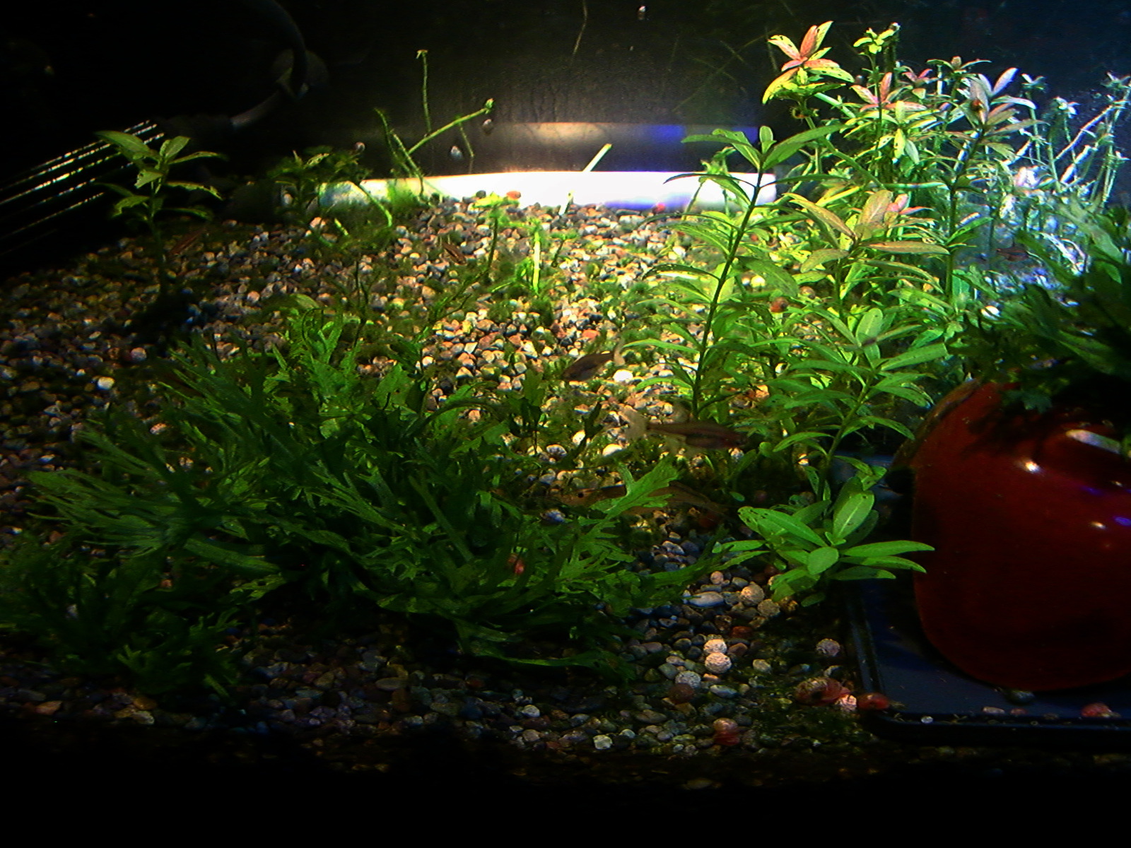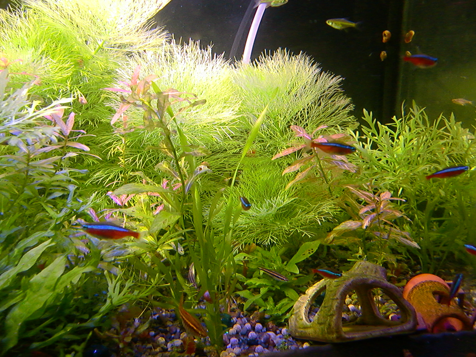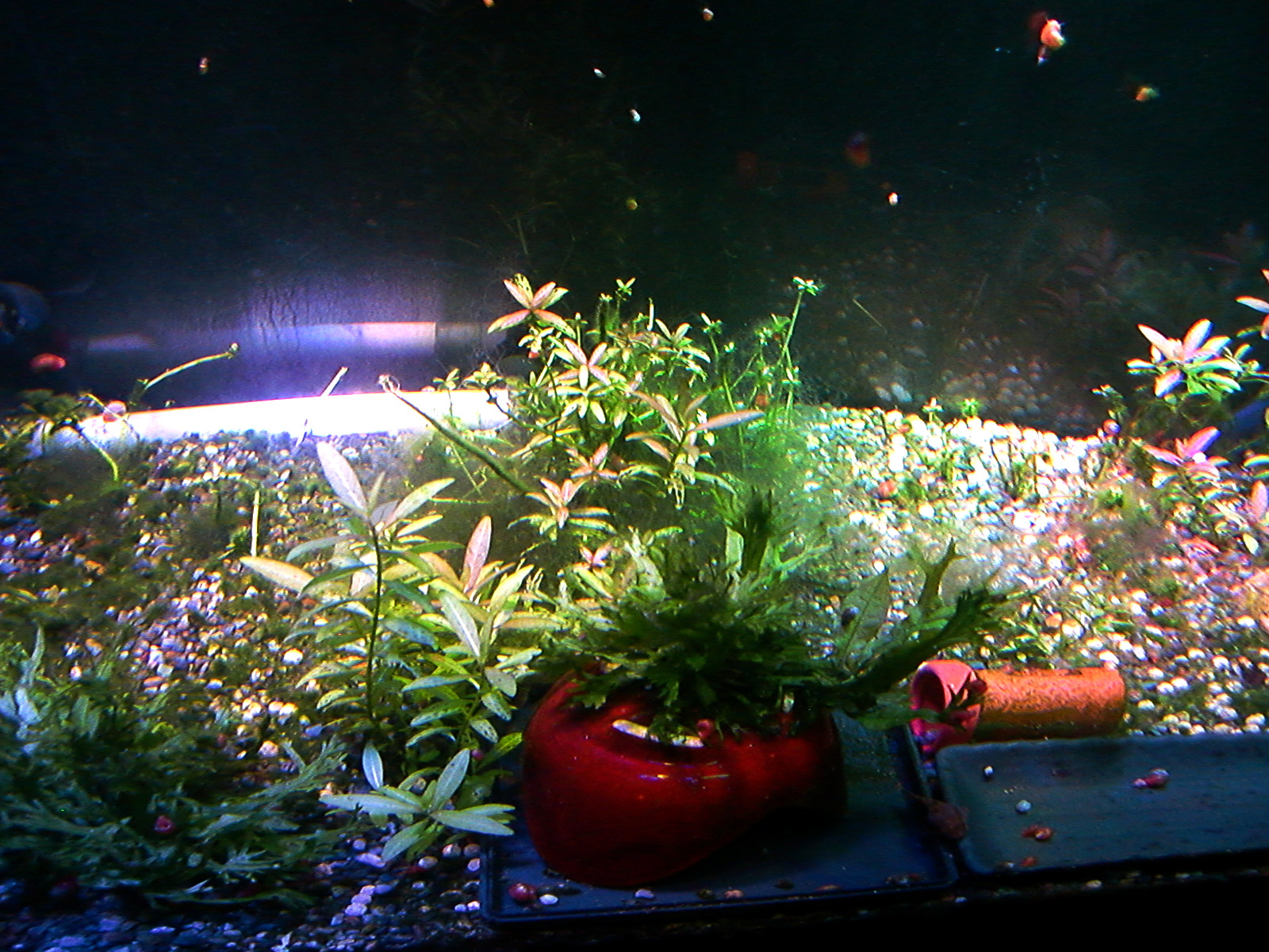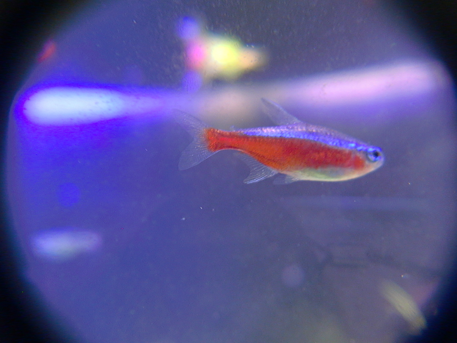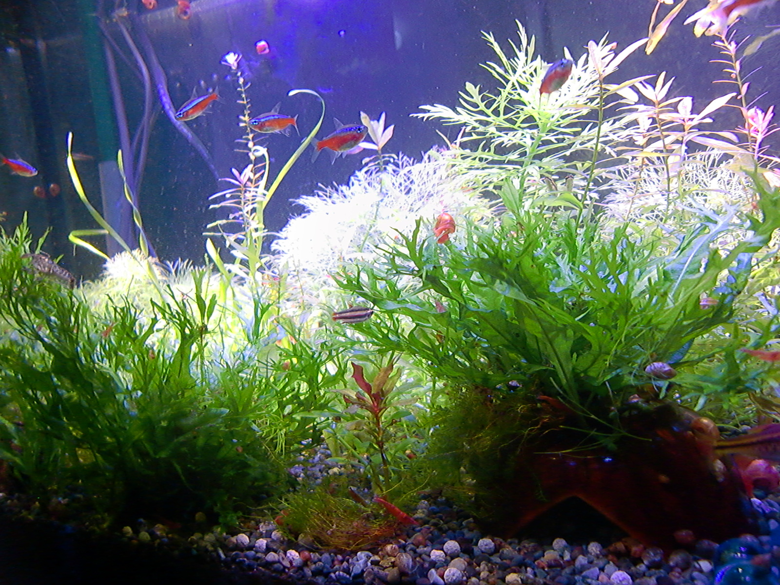 【鮮やかファンタジア】熱帯魚水槽に東芝ビームランプ LEDライト 2014年12月27日 ライトを一個だけ東芝ビームランプLDR15L-W/Fに取り替えてみました。 追記:2018年9月現在はメーカー取り寄せ品になっていて入手困難かも? 現在の高演色ビームランプ100ワット相当LDR12L-D-W 温かみと鮮やかさが両立した名機。水草を追加して発色を比較。 かなり光が黄色い電球色で、ファンタジアタイプという、物が鮮やかに見える光のタイプです。 通常の白色LEDのスペクトルは黄色の波長がピークになって両隣の緑と赤で落ち込んでいくスペクトルなので、ほかの色が薄くなりやすいです。 白色LEDで水草はそれなり普通に育つ(太陽光より落ちるが蛍光灯と比べたら良い、検索できた実験ソースもうちの水槽も同じ)けど人間の目は繊細に感知しています。白色LEDより3波長蛍光灯の方がおおむね鮮やか。 ライトは、光の3原色の青赤緑の波長だけのスペクトルで発光すると、物が鮮やかに見える白色光になります。これが3波長。 この色を薄める波長が、黄色とシアンらしく、これを減らせば鮮やかにできるが、白色LEDはもともとシアンが薄いのが幸いして、黄色だけカットすれば鮮やかに照らせるという理屈です。 ファンタジアの公表スペクトルの模写。かなり黄色成分がカットされています。 予想より明るいです。黄色をカットした分、通常モデルよりやや暗いのかもしれませんが。(商品表示に100ワット相当となっていて普通の2波長ビームランプは150ワット相当になっている) レンズがあるので横から見てもまぶしくないですが、人に向けないように気を付けるべきでしょう。 ボディーはLED特有のヒダヒダがなくてシンプル。 まだコケだらけの水槽でわかりにくいけど、葉の色は鮮やかでしょう? 肉眼の印象でも、温かみもあるし緑色も鮮やかに見えます。 光色が黄色いのは主に緑と赤の混色光(青と黄色も少ないけど入っている)。 トリミング直後でほとんど草が生えていませんが、配光具合を上から確認。 暗めに撮影しました。 明るく撮影するとこうなります() ※肉眼ではこんなになりません。 左半分が東芝ビームランプ1個で右半分がノーブランド15W(黄色波長の強い白色LEDではない原色4色混合なのでもっと鮮やかだけど不自然さがある、追記:2017年壊れました、連絡先も不通…)のスポット2個での明るさ。 東芝ビームランプの照らす範囲は30度と狭いけど、その範囲外もソフトに照らしてます。 手前のミクロソリウム・ウィンデロフにコケを生やさないように奥へ向けて照らしています。ビームの何割かバックスクリーンに当たっています。 ビームの中心をもっと前にして明るさを生かすには、ミクロソリウムをもっと前に植えなおす必要がありそう。でないとモズクみたいなコケがついてしまうので。 右端の青みがかっている場所は別のライトが当たっているエリア。 LDR15L-W/Fはビーム角30と狭いけど、周りにソフトな光が広がっている形です。 中心の強い光を、手前の陰性水草に当てないようにしています。 暗く写っている場所は肉眼だと真っ暗闇ではないです。 魚影や葉陰が底砂に映ったりして水槽内が立体的に見えます。 白色LEDにしては緑色が強く見えています。 手前を明るく撮影すると、奥のもっと明るいところは白く飛びます。 写真的に、冬は電球色の温かみが合いますね。 かなり光が黄色いのに色がはっきり見えるのは驚き。 ただ写真よりも肉眼では光色の黄色さが気になります。となりに白色を置いたせいかもしれませんが。 写真はホワイトバランスをいじっただけで青くも黄色くも撮れるんです。だから気にならない感じにできます。 下は電球色の光が当たっている部分に適した設定で撮影。色温度がそれより高い部分は青くなります。 色温度の差をわかるよう撮影してみました。右側を照らしているスポットは写真ほど青くないです。 白に近い光色ですが電球色にあわせた設定での撮影なので相対的に青く写っています。 この場合は左の方が綺麗に撮れています(もとの印象に近い)が、カメラのホワイトバランス設定により、色温度が違うライト同士を隣においても、どっちかしか綺麗に撮れないです。 色温度を中和 以前の記事【徹底追及!】熱帯魚、水草のためのLED選び【淡水向け】で、電球色のLEDライトは、青色LEDを足せば色温度を上げられるとお伝えしました。 図でいうと、上が電球色、下が白色という色温度になっています。(上と下の図でLEDのブランドが違うので波長のピークの位置が若干ずれてます) 白色LEDは青と黄色にピークがあり、450nm付近の青は青色LEDのもとの色で、隣のなだらかな黄色がピークの光は、もともとは青色LEDの光ですが、青色LEDの上にかぶせた蛍光体に変換されてワイドバンドな黄色になった光です。 こうして青色LEDにかぶせた黄色蛍光体の厚みで白色光の色温度が決まるので、青色LEDの光をかぶせるだけで電球色だった光が白色や海水用ライトのような青みのある白にもなります。 だから