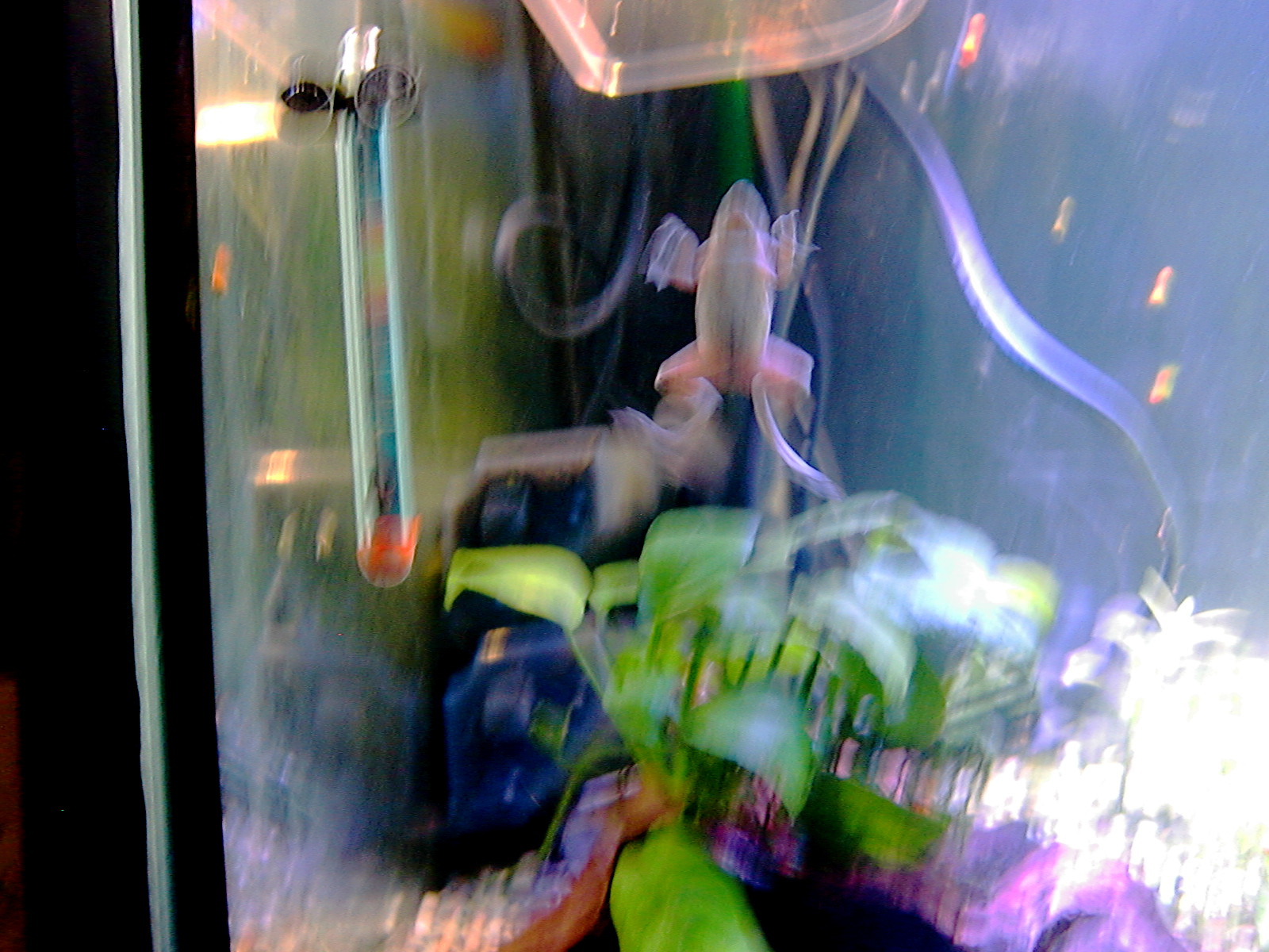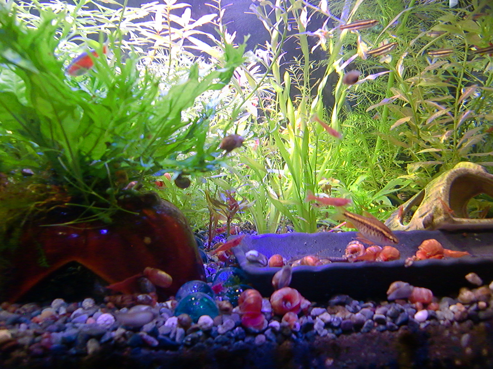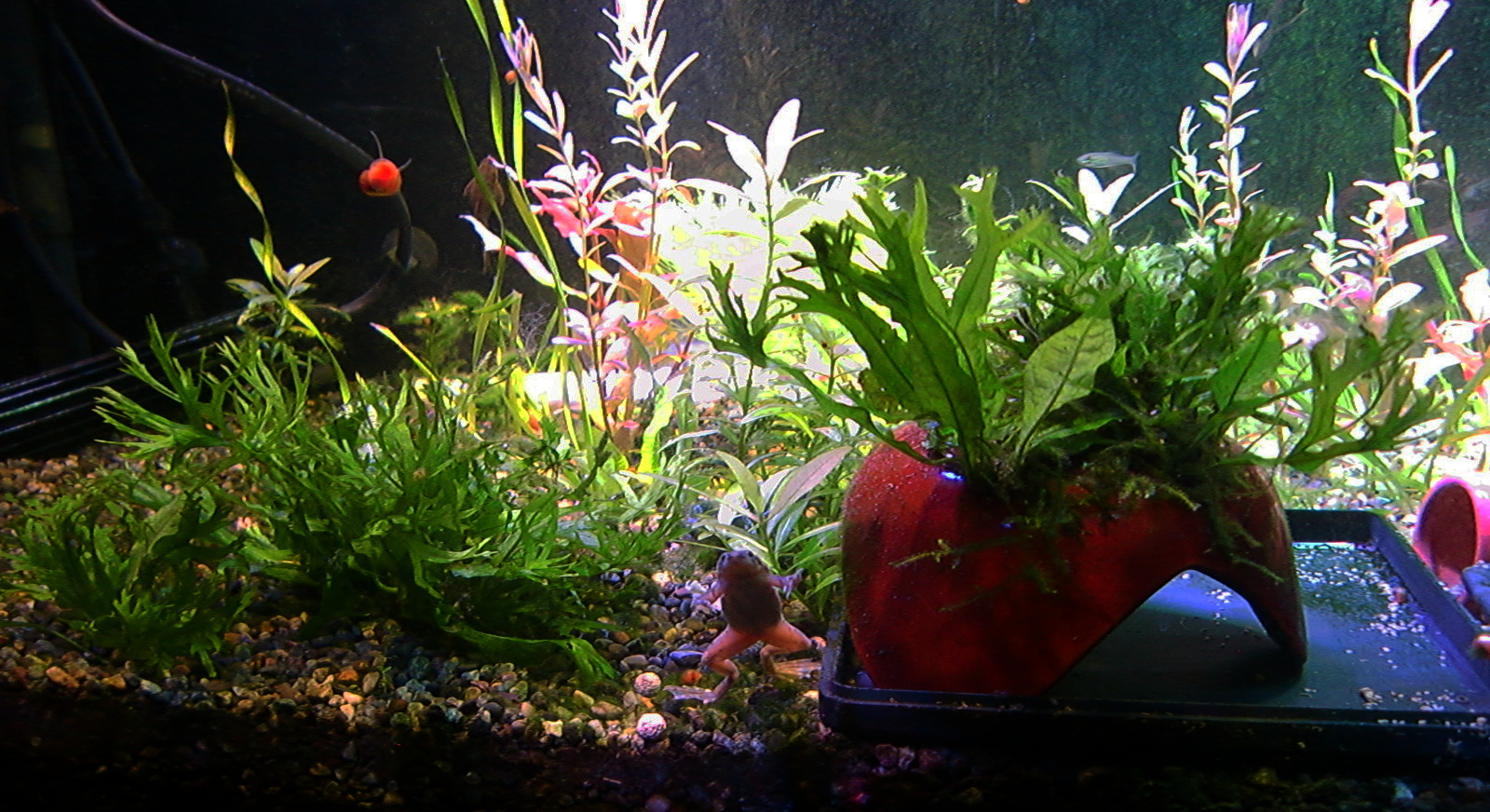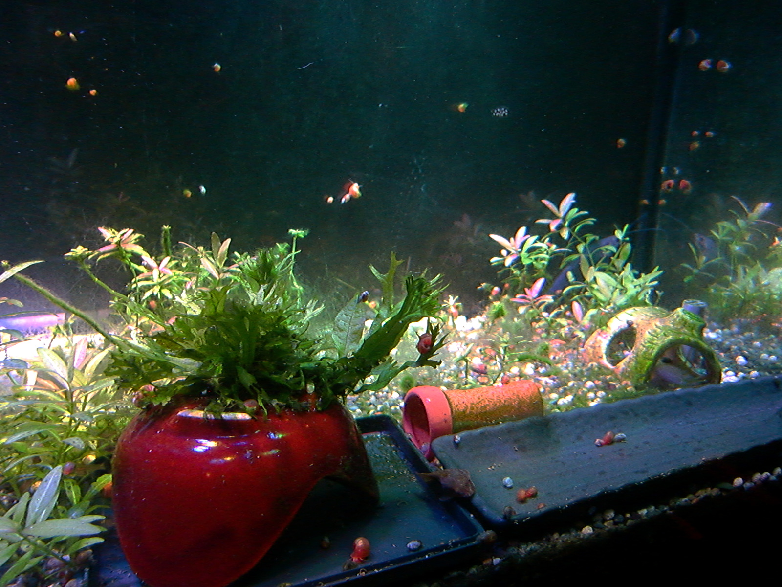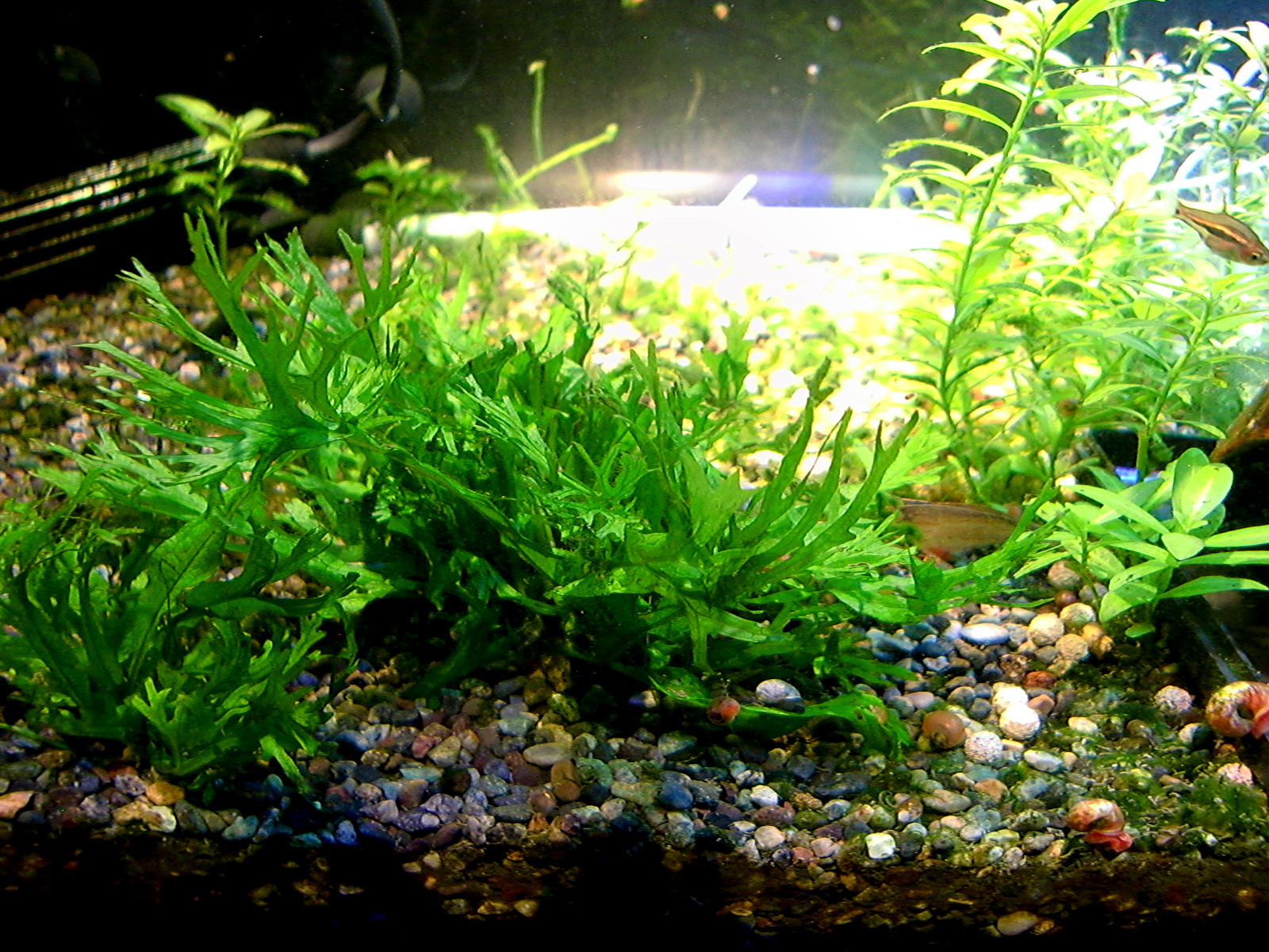 【鮮やかファンタジア】熱帯魚水槽に東芝ビームランプ LEDライト 2014年12月27日 ライトを一個だけ東芝ビームランプLDR15L-W/Fに取り替えてみました。 追記:2018年9月現在はメーカー取り寄せ品になっていて入手困難かも? 現在の高演色ビームランプ100ワット相当LDR12L-D-W 温かみと鮮やかさが両立した名機。水草を追加して発色を比較。 かなり光が黄色い電球色で、ファンタジアタイプという、物が鮮やかに見える光のタイプです。 通常の白色LEDのスペクトルは黄色の波長がピークになって両隣の緑と赤で落ち込んでいくスペクトルなので、ほかの色が薄くなりやすいです。 白色LEDで水草はそれなり普通に育つ(太陽光より落ちるが蛍光灯と比べたら良い、検索できた実験ソースもうちの水槽も同じ)けど人間の目は繊細に感知しています。白色LEDより3波長蛍光灯の方がおおむね鮮やか。 ライトは、光の3原色の青赤緑の波長だけのスペクトルで発光すると、物が鮮やかに見える白色光になります。これが3波長。 この色を薄める波長が、黄色とシアンらしく、これを減らせば鮮やかにできるが、白色LEDはもともとシアンが薄いのが幸いして、黄色だけカットすれば鮮やかに照らせるという理屈です。 ファンタジアの公表スペクトルの模写。かなり黄色成分がカットされています。 予想より明るいです。黄色をカットした分、通常モデルよりやや暗いのかもしれませんが。(商品表示に100ワット相当となっていて普通の2波長ビームランプは150ワット相当になっている) レンズがあるので横から見てもまぶしくないですが、人に向けないように気を付けるべきでしょう。 ボディーはLED特有のヒダヒダがなくてシンプル。 まだコケだらけの水槽でわかりにくいけど、葉の色は鮮やかでしょう? 肉眼の印象でも、温かみもあるし緑色も鮮やかに見えます。 光色が黄色いのは主に緑と赤の混色光(青と黄色も少ないけど入っている)。 トリミング直後でほとんど草が生えていませんが、配光具合を上から確認。 暗めに撮影しました。 明るく撮影するとこうなります() ※肉眼ではこんなになりません。 左半分が東芝ビームランプ1個で右半分がノーブランド15W(黄色波長の強い白色LEDではない原色4色混合なのでもっと鮮やかだけど不自然さがある、追記:2017年壊れました、連絡先も不通…)のスポット2個での明るさ。 東芝ビームランプの照らす範囲は30度と狭いけど、その範囲外もソフトに照らしてます。 手前のミクロソリウム・ウィンデロフにコケを生やさないように奥へ向けて照らしています。ビームの何割かバックスクリーンに当たっています。 ビームの中心をもっと前にして明るさを生かすには、ミクロソリウムをもっと前に植えなおす必要がありそう。でないとモズクみたいなコケがついてしまうので。 右端の青みがかっている場所は別のライトが当たっているエリア。 LDR15L-W/Fはビーム角30と狭いけど、周りにソフトな光が広がっている形です。 中心の強い光を、手前の陰性水草に当てないようにしています。 暗く写っている場所は肉眼だと真っ暗闇ではないです。 魚影や葉陰が底砂に映ったりして水槽内が立体的に見えます。 白色LEDにしては緑色が強く見えています。 手前を明るく撮影すると、奥のもっと明るいところは白く飛びます。 写真的に、冬は電球色の温かみが合いますね。 かなり光が黄色いのに色がはっきり見えるのは驚き。 ただ写真よりも肉眼では光色の黄色さが気になります。となりに白色を置いたせいかもしれませんが。 写真はホワイトバランスをいじっただけで青くも黄色くも撮れるんです。だから気にならない感じにできます。 下は電球色の光が当たっている部分に適した設定で撮影。色温度がそれより高い部分は青くなります。 色温度の差をわかるよう撮影してみました。右側を照らしているスポットは写真ほど青くないです。 白に近い光色ですが電球色にあわせた設定での撮影なので相対的に青く写っています。 この場合は左の方が綺麗に撮れています(もとの印象に近い)が、カメラのホワイトバランス設定により、色温度が違うライト同士を隣においても、どっちかしか綺麗に撮れないです。 色温度を中和 以前の記事【徹底追及!】熱帯魚、水草のためのLED選び【淡水向け】で、電球色のLEDライトは、青色LEDを足せば色温度を上げられるとお伝えしました。 図でいうと、上が電球色、下が白色という色温度になっています。(上と下の図でLEDのブランドが違うので波長のピークの位置が若干ずれてます) 白色LEDは青と黄色にピークがあり、450nm付近の青は青色LEDのもとの色で、隣のなだらかな黄色がピークの光は、もともとは青色LEDの光ですが、青色LEDの上にかぶせた蛍光体に変換されてワイドバンドな黄色になった光です。 こうして青色LEDにかぶせた黄色蛍光体の厚みで白色光の色温度が決まるので、青色LEDの光をかぶせるだけで電球色だった光が白色や海水用ライトのような青みのある白にもなります。 だから