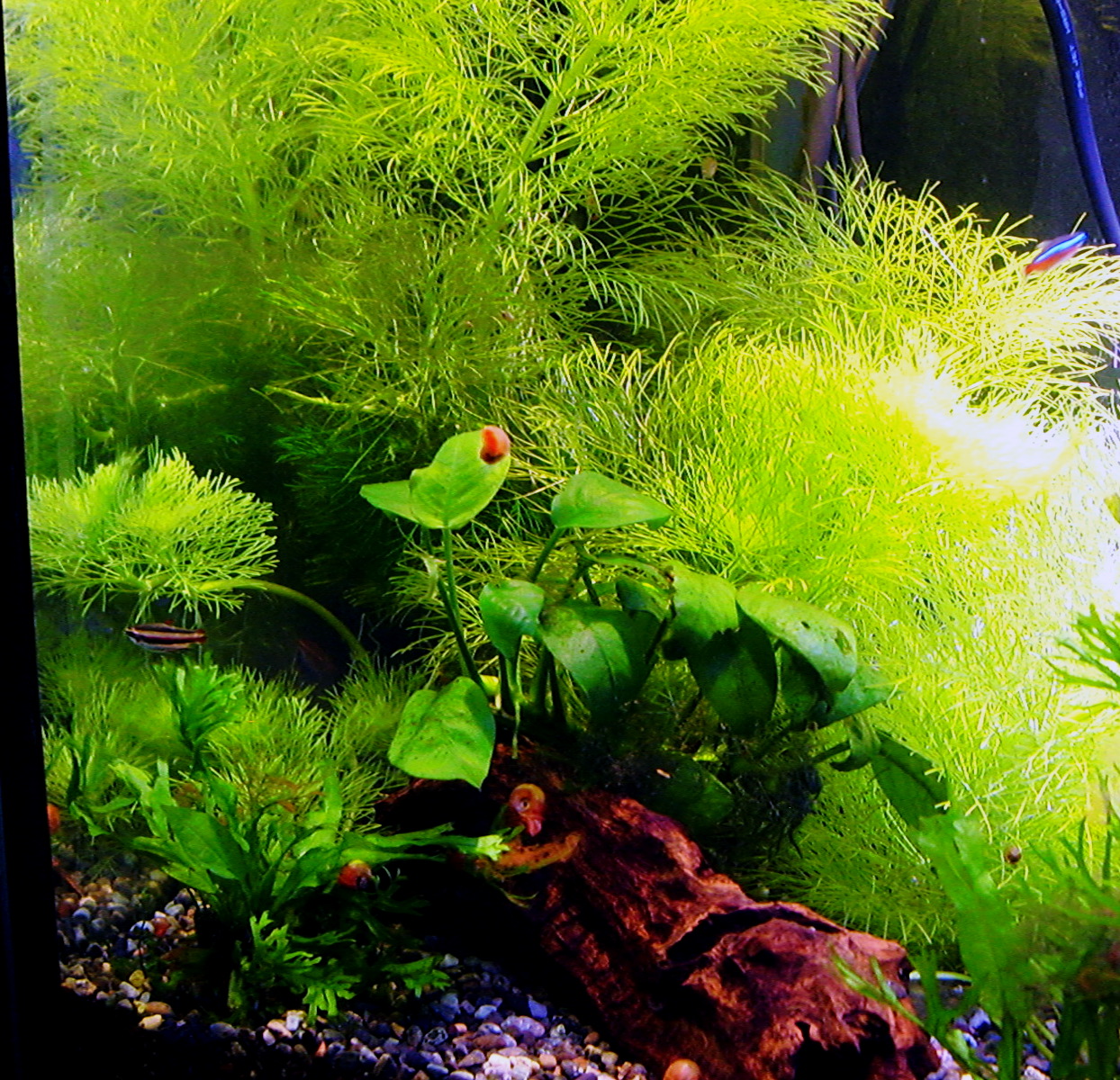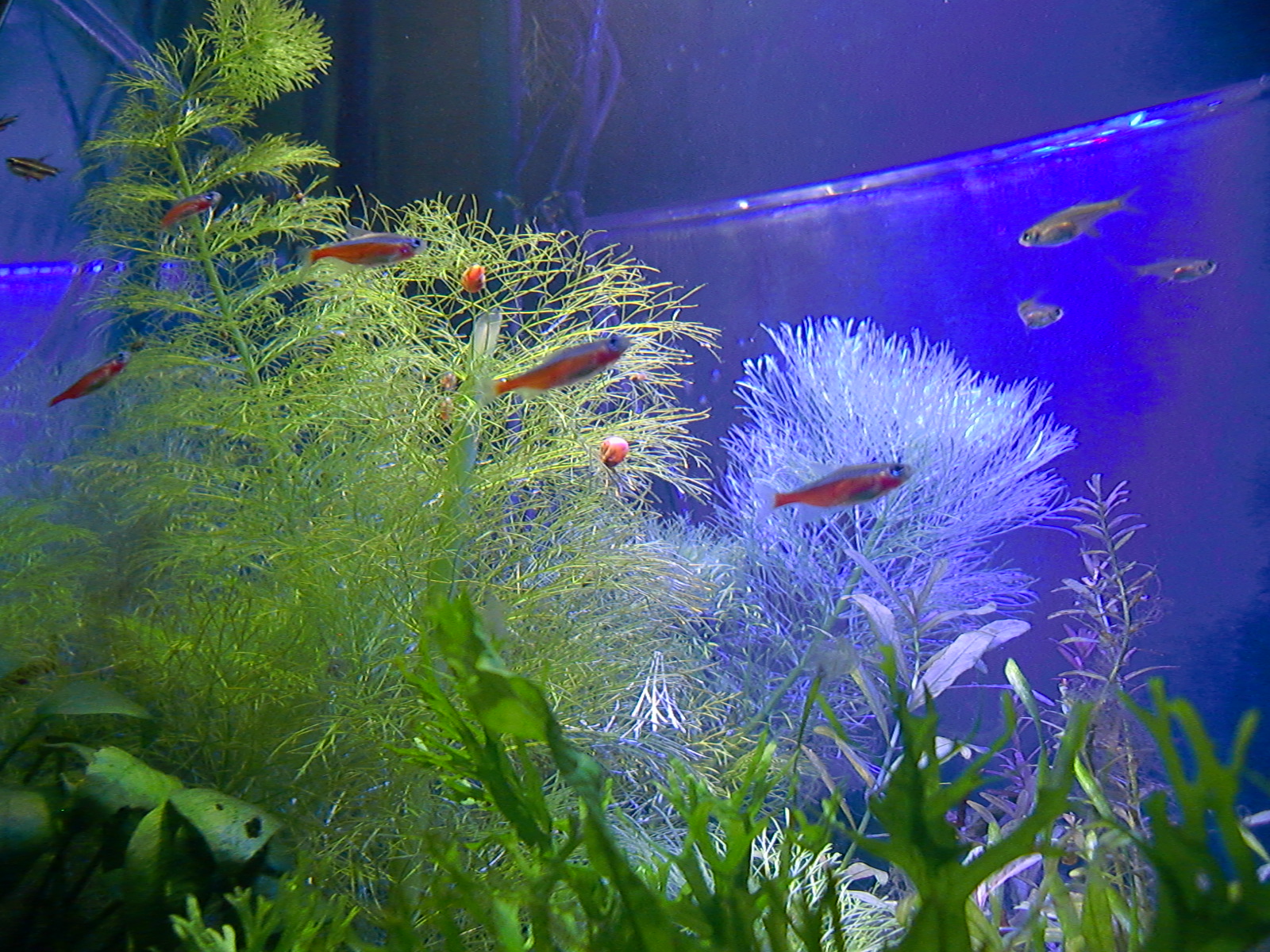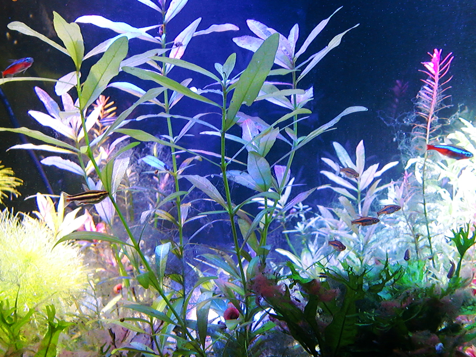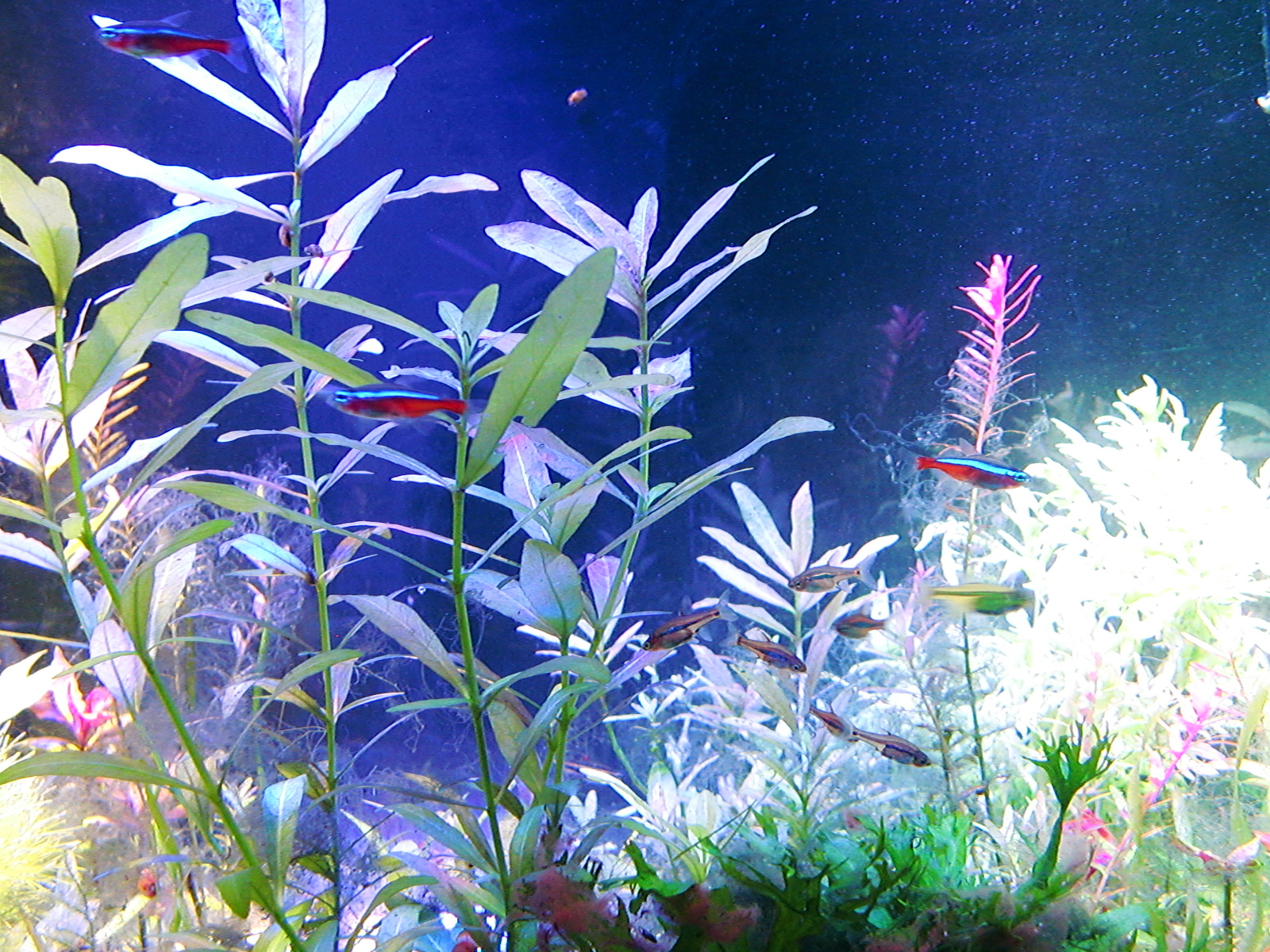 冬の発酵式二酸化炭素と、例の石の爪痕 水草 2015年02月10日 発酵式二酸化炭素は保温しないと発酵が遅くなってしまいます。 崩壊以来、あまりに成長が悪いので年はじめからCO2を添加することに。 ただ温度が低いと発生量が落ちるので、発酵ボトルを水槽へ入れています。 以前使っていた2リットルボトルだと大きすぎるので、500mlのボトルに変更。 ボトルにビー玉など錘を入れると浮かべたとき転覆しなくなります。これで飼育水を全部抜かない限り勝手にこぼれないです。 砂糖25グラム、水約300ml、塩無添加。 温度が26度もあって水が2リットルボトルの時より少ないから、発酵速度が速いので葉が巨大化できますね(汗)。次回は塩入れよう。 あと(高温だから?)混合パイプが詰まりやすいです。3日に一度は竹串で掃除してます。混合パイプはバブルチョイス(追記:発酵液の水位が高いとバイオフィルムで詰まりやすい?) 上の写真奥の松みたいなのは、年末に追加したジャイアント・アンブリアです。 去年夏に不用意に入れた「災いの石」のせいで水質が不調なままの現在、真っ先に溶けると思っていたけど逆に一番成長しました。これまで2回ぐらいトリミング(「災いの石」のいきさつ:微量ミネラルでコケだらけの巻)。 ジャイアントアンブリアは底面フィルターの入った底床に挿しても、お構いなしみたい。pH5以下、KH、GHとも3程度の軟水でも育つんですね。 左は底面フィルターの上に鎮座する「災いの石」。 左が石を取り出す直前の水草。オカルト的な言い方が似合ってしまうなあ。 これに似た石ならなんでもこうなるのだという話ではないです。 現在は石をひとつも入れていませんが、アクアショップで売っているものでミネラル効果をうたわない普通の石や、園芸コーナーの石を何個か入れていた時期の方が長いし、それで悪影響が出たことはありませんでした。取り出した後で明確な変化が出たこともありません。 パッケージの中の、小粒の塊を一個入れただけでコケだらけになったことはこれが始めて。 もしもパッケージ全部投入していたら… 今月。ハイグロフィラは上の写真のそのままの株で、例の石により溶けた部分を取り除くために五分刈りした後そのまま成長した状態。 写真両端と奥が明るくなっていて、明るさの差で白く写っている右下の部分は、肉眼では緑色にみえています。 数個のスポットライトの向け方によってこうなっています。 奥を明るくし手前を暗くすると手前に生きものたちが来てくれます。 ジャイアントアンブリアとハイグロフィラ以外の水草種はまだまだコケに負けぎみ。消えてなくなりはしないけど、これで光も弱かったらやばかった。 成長のためには都合の悪い成分が「災いの石」から溶出して沈殿したものが今も残っているみたい。 泥掃除をして沈殿を取り除けばよさそうなものですが、(持論的に)泥掃除は脱窒作用を阻害するから、なかなかいっぺんには出来ません。 (持論的に)阻害すると毎日換水が必要になるほど硝酸塩が溜まるから生体によくないのです(脱窒は普通に起きている!?エロモナスと硝酸塩の関係)。 実際、秋から泥掃除するたびに硝酸塩濃度が高い傾向になってきており、秋口には硝酸塩濃度5mg/lしかなかったのが現在は100mg/l(換水前)。これ以上掃除したくない状況です。 換水回数を増やすのも生体にダメージなので綱渡り中。 コケは活着力の強いとろろ状。コケに勢いがあった年末までは有茎水草の先端を覆ってしまう成長速度でした。2価鉄を入れすぎると出るようです。成長を促進させようと必要以上に入れると良くないみたい。 水草たちにはしばらくコケにまみれてもらうしか。 リセットしないのはリセット後に、バクテリア環境が整って再び成長を再開したり脱窒もするようになるのは時間がかかるので、調子が戻るまでの所要時間は、水質の調整を続けるのと大差ないと思えるから。 思い返せば、災いの石を入れたら魚にもカラムナリスが再発していたし、体にいい成分ばかりの石ではないかも。 もちろんカラムナリスの原因は「災いの石」のせいではありませんが、こいつから魚体に悪い成分が溶出し、体力が落ちて、以前の感染の時に潜伏した菌にまたやられたのかもしれない、という憶測だけで。(感染の経緯と治療記事:やばいぞカラムナリス 【急死 伝染】)。 災いの石を取り出してから3ヶ月以上経ちますがカラムナリスは再発してないし、少しずつコケも減ってきているので、このまま様子を見ていきます。 太くてかっこいい幹だなあ。 せっかく伸びてきた巨木をぶった切ってしまいました。 するとなぜか元気をなくしていきました。 ジャイアントアンブリアという木はなかなか気難しいお方みたい(草です)。 出演はカージナルテトラ、ナノストムス・マジナータス、ミクロラスボラ・ブルーネオン。 12月~1月に衝動的に追加しました。 2015年3月 冬が終わり気温が上がったのでボトルは水槽外へ。2リットルボトルに戻します。 発酵式が