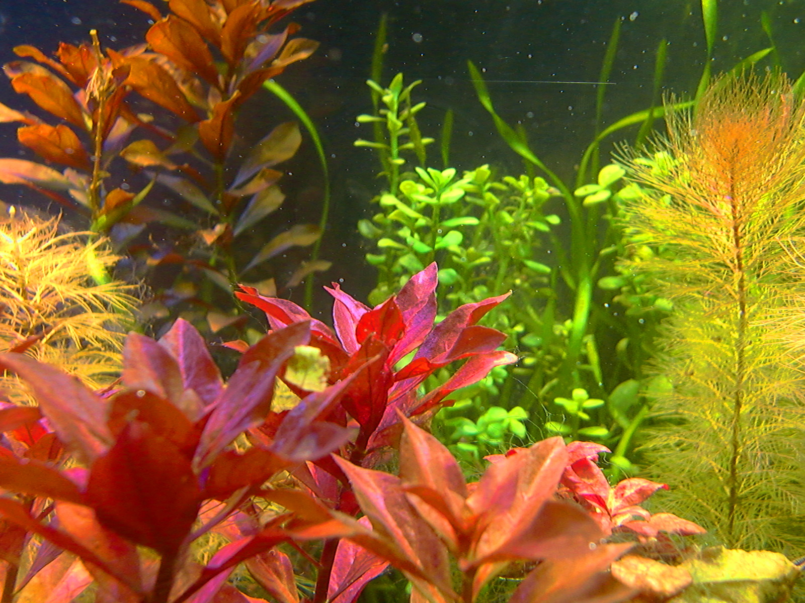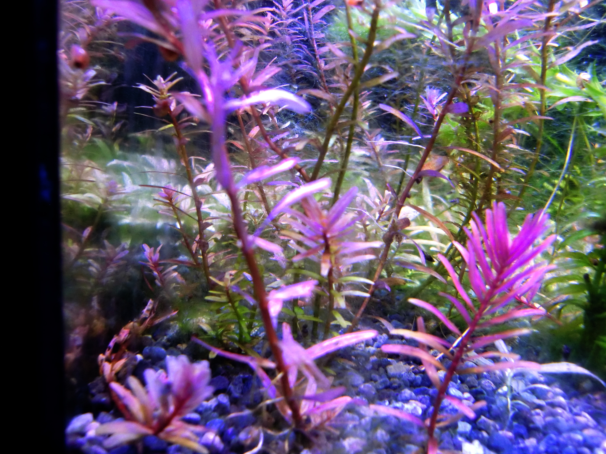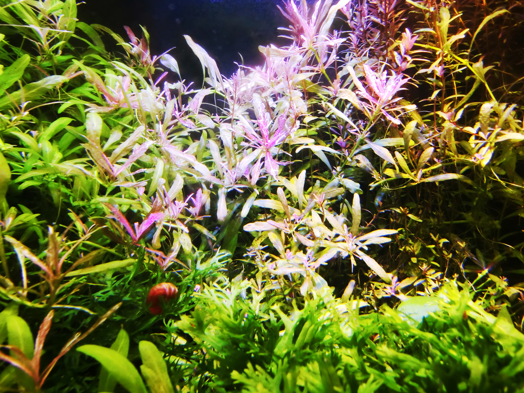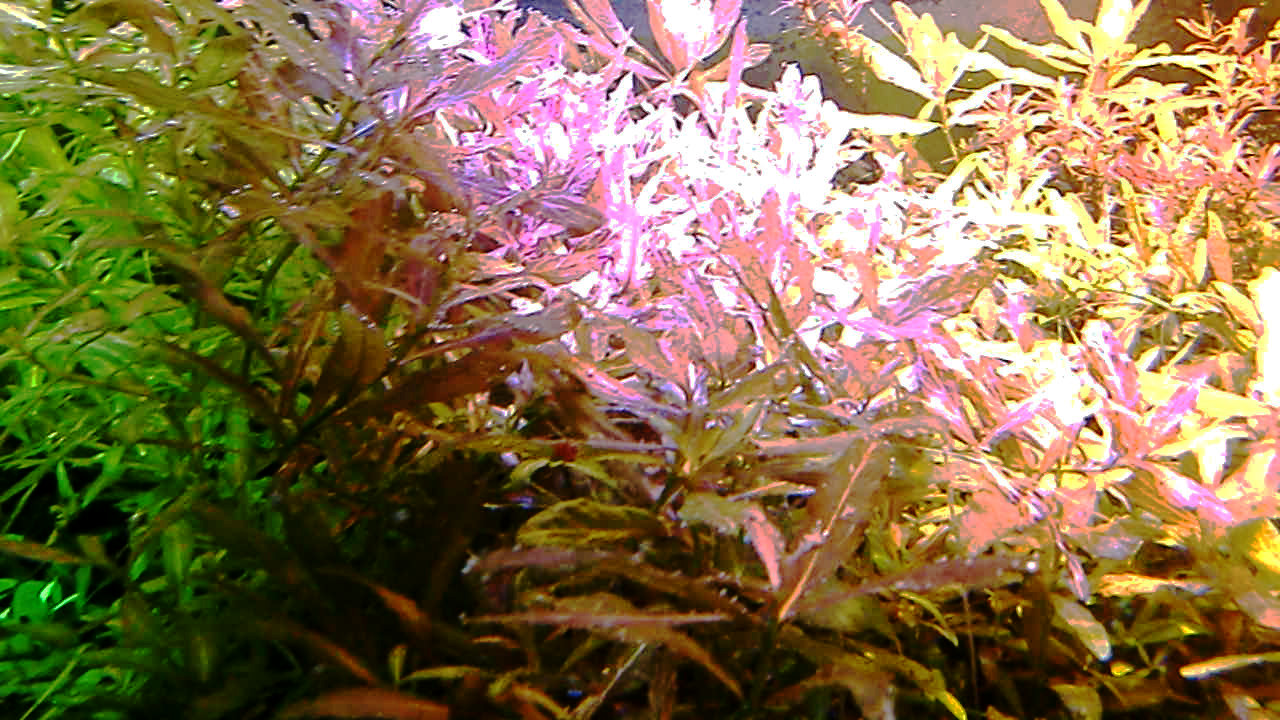 赤系水草の肥料は? 鉄分で赤くなる伝説 水草 2019年01月25日 赤系水草の入った水槽に鉄分を施肥、添加すると葉が赤くなると信じられているその理由は。 緑の有茎水草を育てられる方なら、本当は赤系水草も同じように簡単! ストック水槽もとくに必要ないです。 ルドウィジア・レペンス・ルビン、ロタラ・インディカ、ハイグロフィラ・ロザエネルヴィスの斑紋などを赤く育ててきた経験上、はっきり言うと鉄分の添加は控えめが一番だと考えています。 「鉄分の添加で葉が赤くなる」は都市伝説だからです。 再現しないことが多い。 鉄分肥料を入れても水草が赤くならないで藻類だらけになることがよくありますね? UFOの正体が気象現象だったりするのと同じで、「誤解されやすいカラクリがあるだけ」なのです。 当ブログでは赤くなった水草の写真を幾度もUPLOADしながら報告しているので、よく見に来られる方々はとうにご存知かもしれませんね。 私が初心者のとき赤系水草の情報を知らずに店頭での美しさに惚れて購入したときは、緑色の状態しかキープできませんでした。 写真左端のひょろひょろの有茎水草はロタラ・インディカです。 このように赤くない、または緑になってしまうのが普通だと思います。 勘違いする原因 育てている草が赤系水草なのに緑になるのは、多くの場合、 栄養や水質ではなくライトにレンズがないから光が足りないだけです。 しかし、鉄分を添加すると、弱いライトでも、赤い葉を見ることができることがあります。 それはなぜか。 間延びすると赤い葉が出る アクアリウム用のとりわけ水草用と銘打たれたライトは全光束が大きいので、水面付近の葉なら赤くできます。 全光束が大きいライトなら、すぐそばの水草を赤くすることができる。つまりちょっと離れるとレンズがない限り赤くできないのです。 鉄分を添加すると、水草は間延びしやすくなります。 間延びしたので水草が水面まで伸びたから、新しい葉がライトに近いので光をたっぷり浴びて赤く成長。 というなりゆきによって、鉄分が必要なのではという誤解をしやすいだけなんです。 こういう誤解をするということは使用しているライトが弱いからです。 差し戻せばわかるライトの弱さ その証拠に、赤くなった部分をカットして、底へ差し戻すとその葉も次の葉も緑に戻ってしまいます。 さらに、そこへ鉄分を再度添加しても緑のままで、藻類におおわれて育成に失敗したりします。 カットしたての短い茎は、いくら間延びしたとしても水面付近には届かなかったからです。 赤系水草が水面付近しか赤くならないのは、水質でも肥料でもなくライトが弱いからなのです。 当ブログの写真では水深は全く関係なく赤くなっています。 緑色になってしまう葉もあるのですが、ほぼ赤を堪能できるような状態。 これは「鉄分のコントロールが絶妙だから」などという、伝説の仙人的な話では全然ないのです。 現在のルドウィジアのトリミング期間は4~10週間。 水深が深くて底のあたりから育てることと、間延びしないから、そんなにトリミング期間が短くなりません。 写真の状態から言っても、水草の状態をキープするのが上手ではないのがモロバレではないですか?(笑) 赤系水草のだいご味 赤さを増すためには、光をいかにして当てるかにこだわることが大事。 隣の水草が急成長してかぶってしまうと緑色になったりするので、光のコントロールが一番気を使うポイントです。 「強い赤を引き出す」面白さ。 ライトが強いと 高度なレイアウトがなくとも赤くなる 高度なレイアウトというか、ダッチ式とかネイチャーアクアリウムという一種の流派では、赤い水草は頂点だけが、上の方に見えるように、根元を流木や中景種などで隠すようにレイアウトするものですね。 赤い葉は水槽の上の方でしか維持できないことが経験的にわかっている方々のやり方が根付いたものなのでしょう。 水面付近だけだから、トリミング期間が非常に短いので大変面倒な方法なのでは。 トリミング期間が伸ばせる しかし、私のようなヒドいレイアウト技術でも、ライトを適したものにすれば、全然問題なく赤い葉を鑑賞できるようになります。 赤系水草を鑑賞したいから手前に植えるという当たり前のことが、ライトをかえることでやっと許されるんです。 生き物の混泳が好きなのでレイアウトのために大きな改造はできない(生体に壊される)けど、赤系水草も楽しみたいので、水槽の手前に大々的に植えています。 ライトが強ければ、後景種であっても間延びしないため、前景水草を手前に置いて根元を隠す必要がありません。 隠れやすい生体を鑑賞できる そのため、隠れやすい底モノの生体を入れても、奥に隠れる所がないなら、手前にも来てくれて鑑賞ができる利点があるのです。 下はドワーフザリガニと赤系水草「ルドウィジア・レペンス・ルビン」の根本の写真 蛍光灯だけを点灯してもこんな色です。赤いランプを照らして