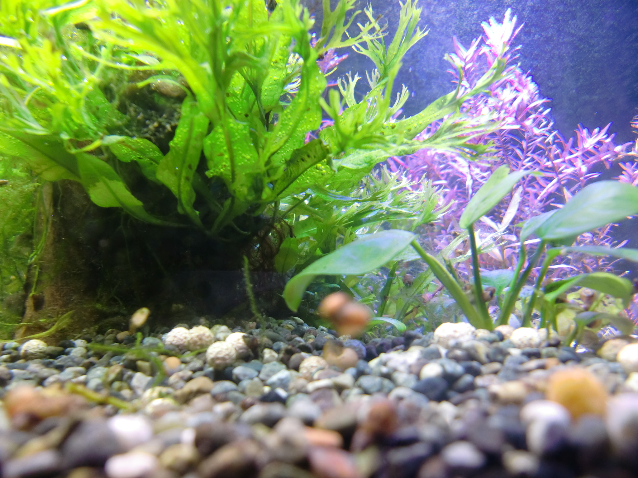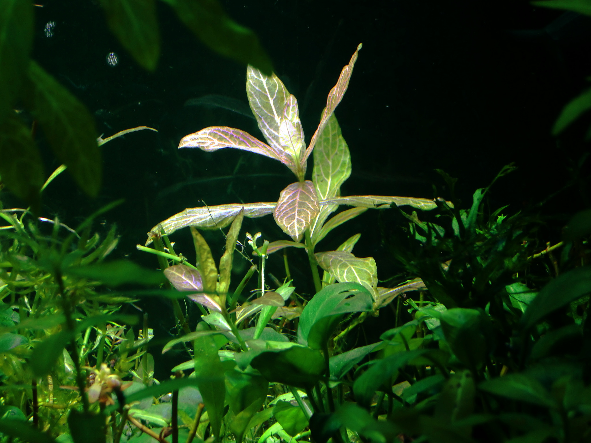 【ピンクになるよ】ハイグロフィラ・ロザエネルヴィス 水草 2013年09月14日 どうしても緑になってしまうという、ハイグロフィラ・ロザエネルヴィスをうちの水槽でピンクに成長させた方法を記事にしました。 カットして2週間後に成長した葉の写真です。発酵式CO2の添加量が多すぎたのか、葉が妙に長くなってしまいましたが、ちゃんとピンクの葉が出ていますね。(2015.1.20改定) ハイグロフィラ・ロザエネルヴィス ハイグロフィラ ロザエネルヴィスは葉脈が白く目立ち葉が縮れてピンクに色づく改良品種(原種はポリスペルマ)です。 写真はかなり大きな葉をつけていますが、CO2の添加量と植え方で葉の大きさが変わるようです。 水槽に入れるとショップにあったときより色が落ちて緑になってしまうのが普通だと思います。 買うときにも、緑になるのを覚悟していました。 購入した頃はライトをスポットLEDに換える前で、購入した赤系水草が赤くならないのはいつものことだったので。 家族受けを狙って一時的に鑑賞できればいいと思っていました。 でも丈夫で、照明を取り替える前は、緑になりながらも、アオミドロと黒ヒゲに覆われた中から復活してくれました。 だから、もし導入直後などで成長不良になったとき、すぐに捨てないで様子を見てあげれば、きれいに育てられるチャンスが見つかるかも。 貧栄養は絶対条件じゃない 水槽内を貧栄養状態にすると赤くできるという情報も見た事があります。 しかし当水槽では葉脈が赤くなった葉が密生している状態であっても、硝酸塩が多すぎるほど検出するし、生体への餌も皿の上にまくほど多く、二価鉄やカリウムを添加しているので、貧栄養ではありません。 低光量がピンクにならない原因 スポットLEDの導入後の変化とその後の安定成長により、ハイグロフィラ・ロザエネルビスは強い光で赤く出来ることがわかりました。 藻類で覆われると光が足りないことも 成長中の新葉が十分光を浴びると赤くなるようで、葉面がコケに覆われてしまうと光が足りなくなるので赤くならない、だから添加剤を控えた方がいいという意見が出たり、換水直後の新しい水の方が赤くなるという意見がでたりしたと考えます。 スポットなら多少のコケが付いても赤くなります。 新芽のうちに赤くなるかが分かれ目 観察していると赤くならないうちに葉が成長し終わってしまうと、もうその葉は赤くなりません。 水槽内は上の方が光が強い(ライトに近い方が強い)ので、スポットが照らせないなどライトが弱めの場合は、上まで成長させて頂点を鑑賞することになるでしょう。 頂点は鑑賞しにくいのでライトとハイグロフィラを手前に置く手もあり。 新葉が緑になって成長してしまうと、後からそこに強光を当ててもその葉はもう赤くできません。次の葉を強光で赤くすることはできます。 高速成長させるとコケが減る CO2を添加したり肥料などで成長スイッチが入ったハイグロフィラは目に見えてコケを減らしていきました。 差し戻しで本数を増やして、それを密植せず、間隔を置いて植えておくと巨大化しやすいので、コケ抑制効果が高いみたい。 多少かっこ悪くても、密植すれば小さくなる(カット後から)のでコケが消えてから小さくすればいいかも。 高さのある水槽 99年に熱帯魚ショップで中古の水槽をもらってきました。125リットルのちょっと大きめサイズ。水質はとても安定します。バケツ一杯換水しただけでは硝酸塩がほとんど減りません。テトラ テスト 6 in 1 試験紙で測定。 水を抜くと一人で持てるのでアクリルっぽいです。 ライトが暗かったときの状況 水深が50cmほどあるので有茎のトリミングが楽になると思ったら大間違いでした。 この面白さはなんだろう。才能の片鱗ですか。 写真は勝手に明るく撮影されているけど、照度は屋外(十万lx)よりもずっと低い(数千~数百lx)です。 99年ごろからこの水槽を使用していますが、水深があるため従来のメタハラや蛍光灯などのライトだと20cmリフトアップしたような状態なので、照度が極端に落ちてしまう欠点がありました。 だから茎がひょろひょろ伸長して水面付近まであっというまに到達して、水面付近の葉だけがきれいだったり、アマゾンソードが水面に花を咲かせて親株が溶けるなど、めちゃくちゃなコンディションでした。 なので「低い所に届く光の強さが弱いと茎ばかり伸びて綺麗にならない」とずっと思っていました。 そこでレンズのあるライトを使えばいいだろうと、ホームセンターでビームランプ(作業灯)を買ってきたら、レンズがいいかげんなのか光が満遍なく広がらず、うまく水草を照らせませんでした。 せっかくの休日にこんな水槽を眺めても面白いはずがありません。だから放置気味。 そんな状況がスポットLEDに交換するまで15年近く続きました。 近年出始めたスポットLEDも、ネット上の評価は散々なので期待していませんでした。 ライトの強さで緑からピンクへ しかし白色LEDには出ない紫色