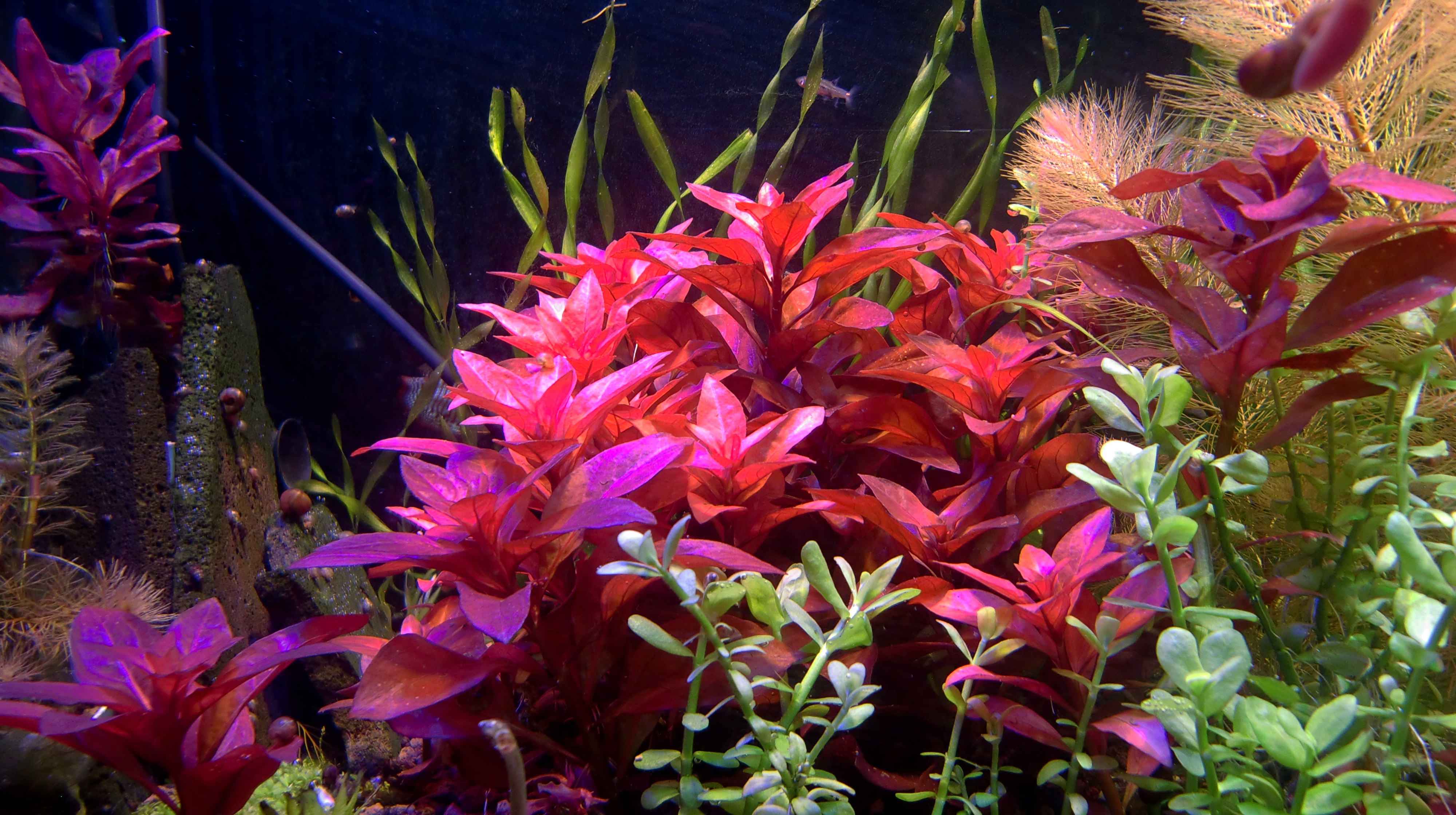 写真は結果的に水草の育成は大成功にみえますが、実はキューバパールグラスの成長を促進したかっただけ(しかも失敗、グーラミィの泡巣の材料にされて増やせませんでした)で、その他の水草たちは大して変化もありません。