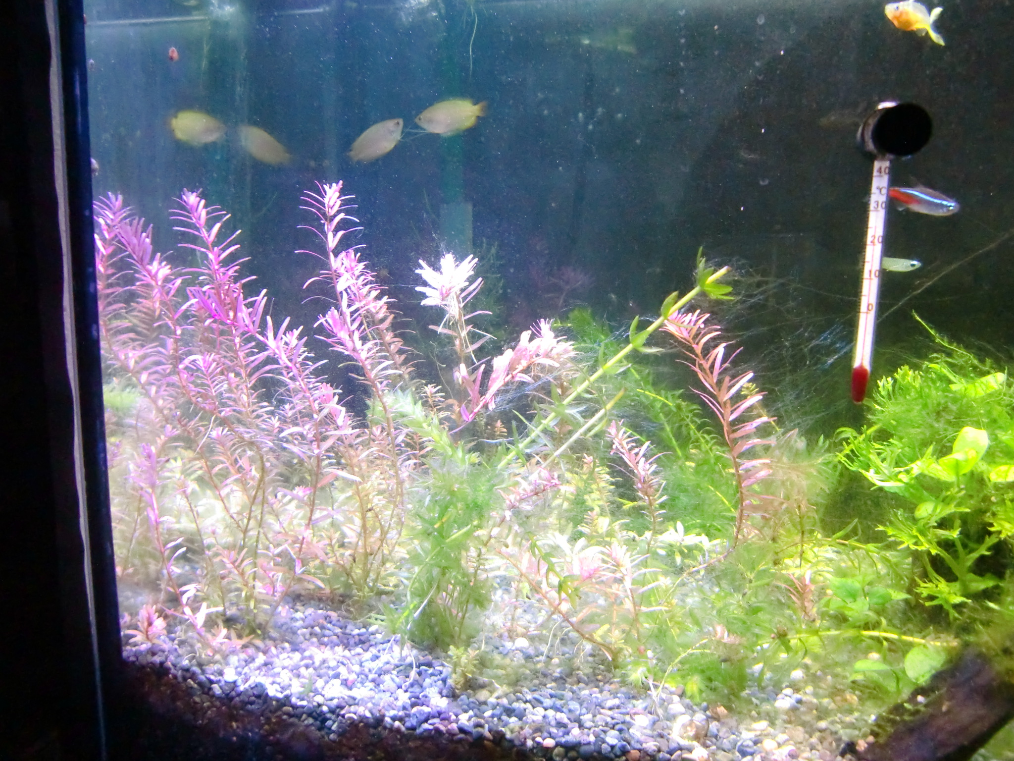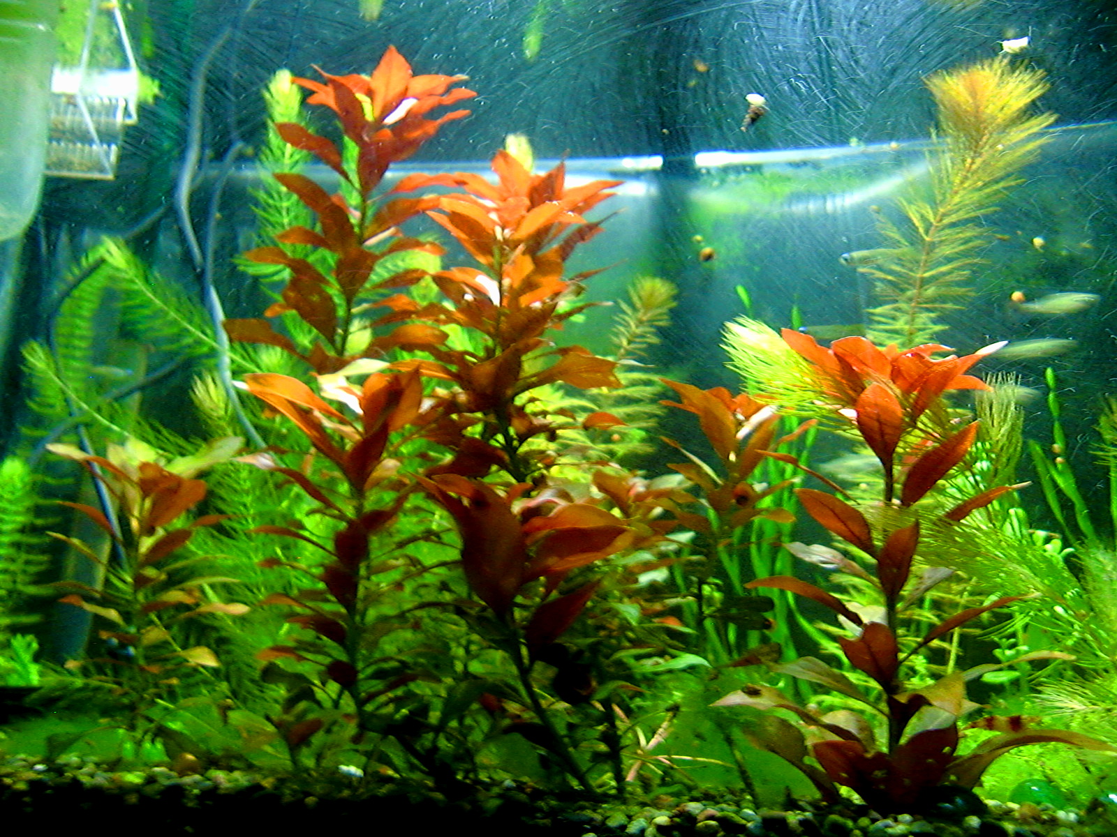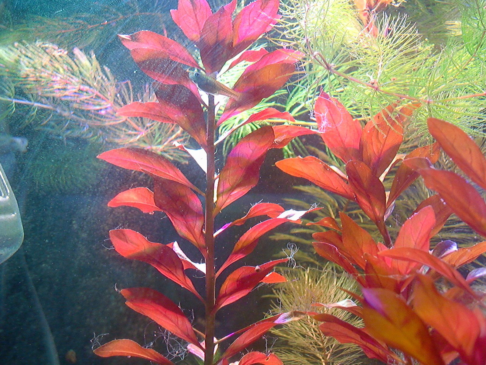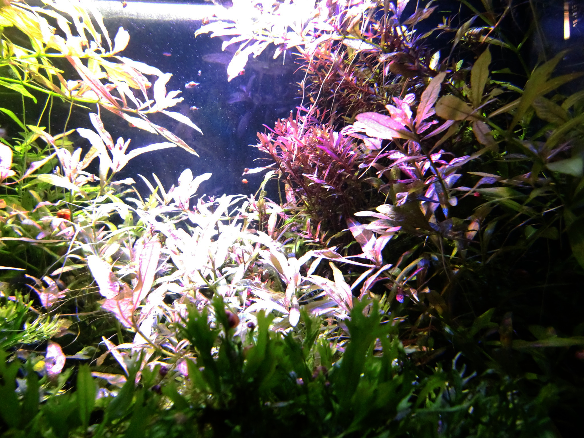 赤系水草の肥料は? 鉄分で赤くなる伝説 水草 2019年01月25日 赤系水草の入った水槽に鉄分を施肥、添加すると葉が赤くなると信じられているその理由は。 緑の有茎水草を育てられる方なら、本当は赤系水草も同じように簡単! ストック水槽もとくに必要ないです。 ルドウィジア・レペンス・ルビン、ロタラ・インディカ、ハイグロフィラ・ロザエネルヴィスの斑紋などを赤く育ててきた経験上、はっきり言うと鉄分の添加は控えめが一番だと考えています。 「鉄分の添加で葉が赤くなる」は都市伝説だからです。 再現しないことが多い。 鉄分肥料を入れても水草が赤くならないで藻類だらけになることがよくありますね? UFOの正体が気象現象だったりするのと同じで、「誤解されやすいカラクリがあるだけ」なのです。 当ブログでは赤くなった水草の写真を幾度もUPLOADしながら報告しているので、よく見に来られる方々はとうにご存知かもしれませんね。 私が初心者のとき赤系水草の情報を知らずに店頭での美しさに惚れて購入したときは、緑色の状態しかキープできませんでした。 写真左端のひょろひょろの有茎水草はロタラ・インディカです。 このように赤くない、または緑になってしまうのが普通だと思います。 勘違いする原因 育てている草が赤系水草なのに緑になるのは、多くの場合、 栄養や水質ではなくライトにレンズがないから光が足りないだけです。 しかし、鉄分を添加すると、弱いライトでも、赤い葉を見ることができることがあります。 それはなぜか。 間延びすると赤い葉が出る アクアリウム用のとりわけ水草用と銘打たれたライトは全光束が大きいので、水面付近の葉なら赤くできます。 全光束が大きいライトなら、すぐそばの水草を赤くすることができる。つまりちょっと離れるとレンズがない限り赤くできないのです。 鉄分を添加すると、水草は間延びしやすくなります。 間延びしたので水草が水面まで伸びたから、新しい葉がライトに近いので光をたっぷり浴びて赤く成長。 というなりゆきによって、鉄分が必要なのではという誤解をしやすいだけなんです。 こういう誤解をするということは使用しているライトが弱いからです。 差し戻せばわかるライトの弱さ その証拠に、赤くなった部分をカットして、底へ差し戻すとその葉も次の葉も緑に戻ってしまいます。 さらに、そこへ鉄分を再度添加しても緑のままで、藻類におおわれて育成に失敗したりします。 カットしたての短い茎は、いくら間延びしたとしても水面付近には届かなかったからです。 赤系水草が水面付近しか赤くならないのは、水質でも肥料でもなくライトが弱いからなのです。 当ブログの写真では水深は全く関係なく赤くなっています。 緑色になってしまう葉もあるのですが、ほぼ赤を堪能できるような状態。 これは「鉄分のコントロールが絶妙だから」などという、伝説の仙人的な話では全然ないのです。 現在のルドウィジアのトリミング期間は4~10週間。 水深が深くて底のあたりから育てることと、間延びしないから、そんなにトリミング期間が短くなりません。 写真の状態から言っても、水草の状態をキープするのが上手ではないのがモロバレではないですか?(笑) 赤系水草のだいご味 赤さを増すためには、光をいかにして当てるかにこだわることが大事。 隣の水草が急成長してかぶってしまうと緑色になったりするので、光のコントロールが一番気を使うポイントです。 「強い赤を引き出す」面白さ。 ライトが強いと 高度なレイアウトがなくとも赤くなる 高度なレイアウトというか、ダッチ式とかネイチャーアクアリウムという一種の流派では、赤い水草は頂点だけが、上の方に見えるように、根元を流木や中景種などで隠すようにレイアウトするものですね。 赤い葉は水槽の上の方でしか維持できないことが経験的にわかっている方々のやり方が根付いたものなのでしょう。 水面付近だけだから、トリミング期間が非常に短いので大変面倒な方法なのでは。 トリミング期間が伸ばせる しかし、私のようなヒドいレイアウト技術でも、ライトを適したものにすれば、全然問題なく赤い葉を鑑賞できるようになります。 赤系水草を鑑賞したいから手前に植えるという当たり前のことが、ライトをかえることでやっと許されるんです。 生き物の混泳が好きなのでレイアウトのために大きな改造はできない(生体に壊される)けど、赤系水草も楽しみたいので、水槽の手前に大々的に植えています。 ライトが強ければ、後景種であっても間延びしないため、前景水草を手前に置いて根元を隠す必要がありません。 隠れやすい生体を鑑賞できる そのため、隠れやすい底モノの生体を入れても、奥に隠れる所がないなら、手前にも来てくれて鑑賞ができる利点があるのです。 下はドワーフザリガニと赤系水草「ルドウィジア・レペンス・ルビン」の根本の写真 蛍光灯だけを点灯してもこんな色です。赤いランプを照らして